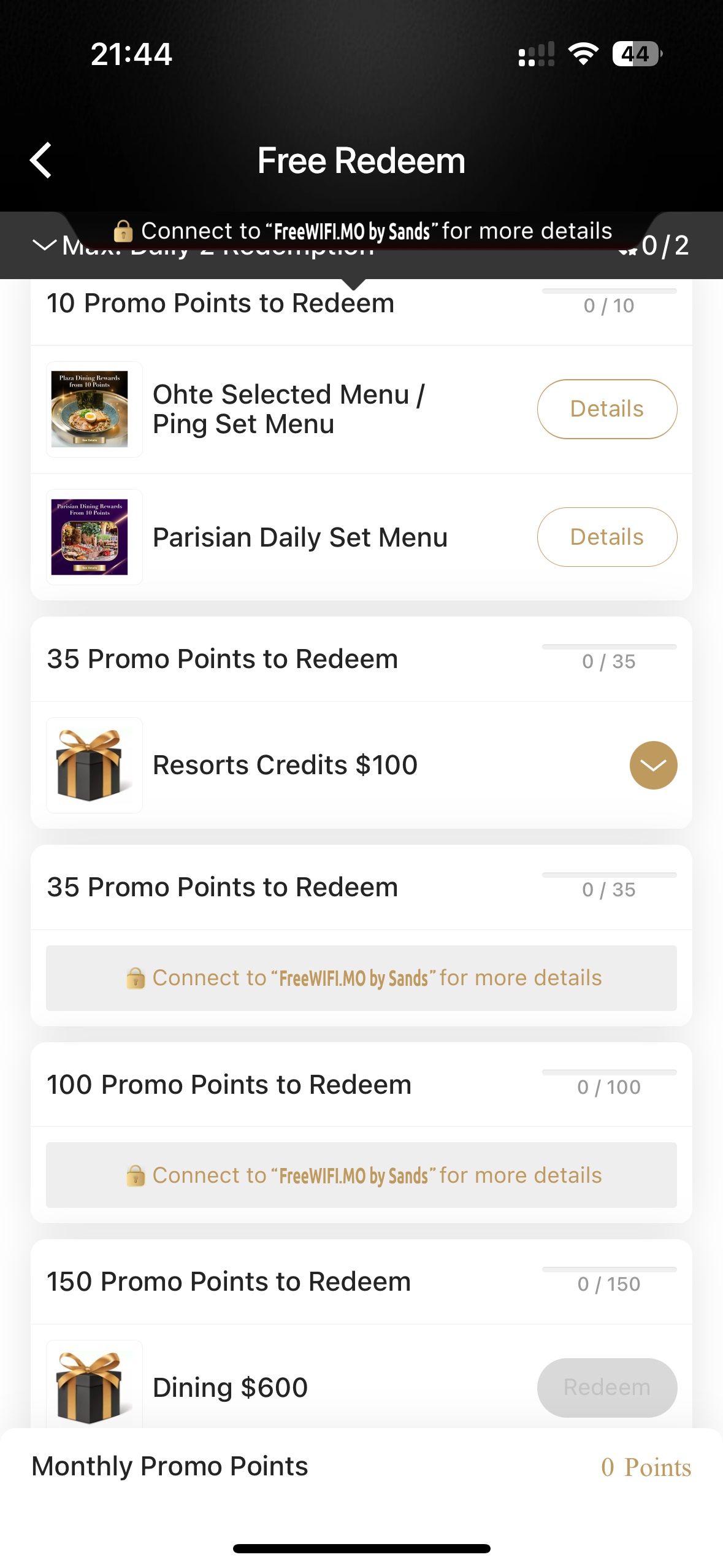 セットメニューではないですが、当日35ポイントで100HKDのリゾートクーポンがもらえるので食事にも使えると思います。当日150ポイントだと600HKDのダイニングクーポンがもらえるのでコパで安めのステーキも食べられるでしょうかね。クーポンは金沙会のカウンターで発券してくれます。