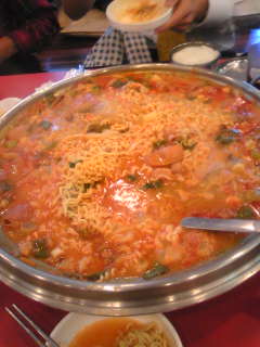 この鍋はブデチゲ(軍隊鍋)の一種で、戦後、アメリカ軍からの払い下げのハムやサラミやインスタント麺をチゲ鍋で煮込んだのがルーツだとか。
