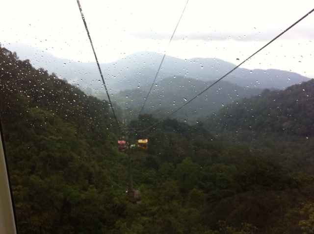 写真は2000mの山の上のゲンティンハイランドから麓まで下る際のロープウェーから撮った写真です。乗車して直ぐ雲の中(霧ではなく)へ急降下するときは恐怖を味わえます。延々15分ぐらい乗車しますのでアトラクションとしても秀逸です。しかも片道5RT(120円)です。