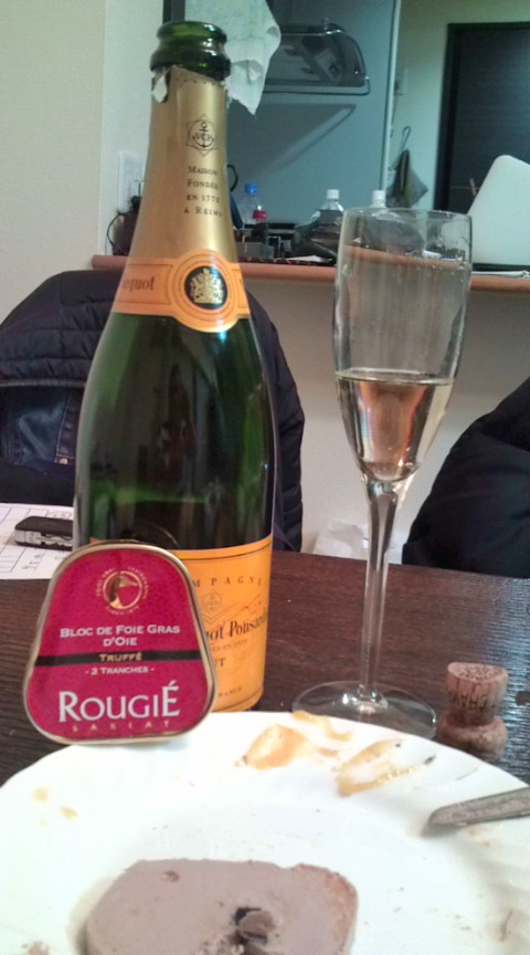 Champagneで乾杯し先日、友人に貰ったフォアグラをツマミに母に送って貰った