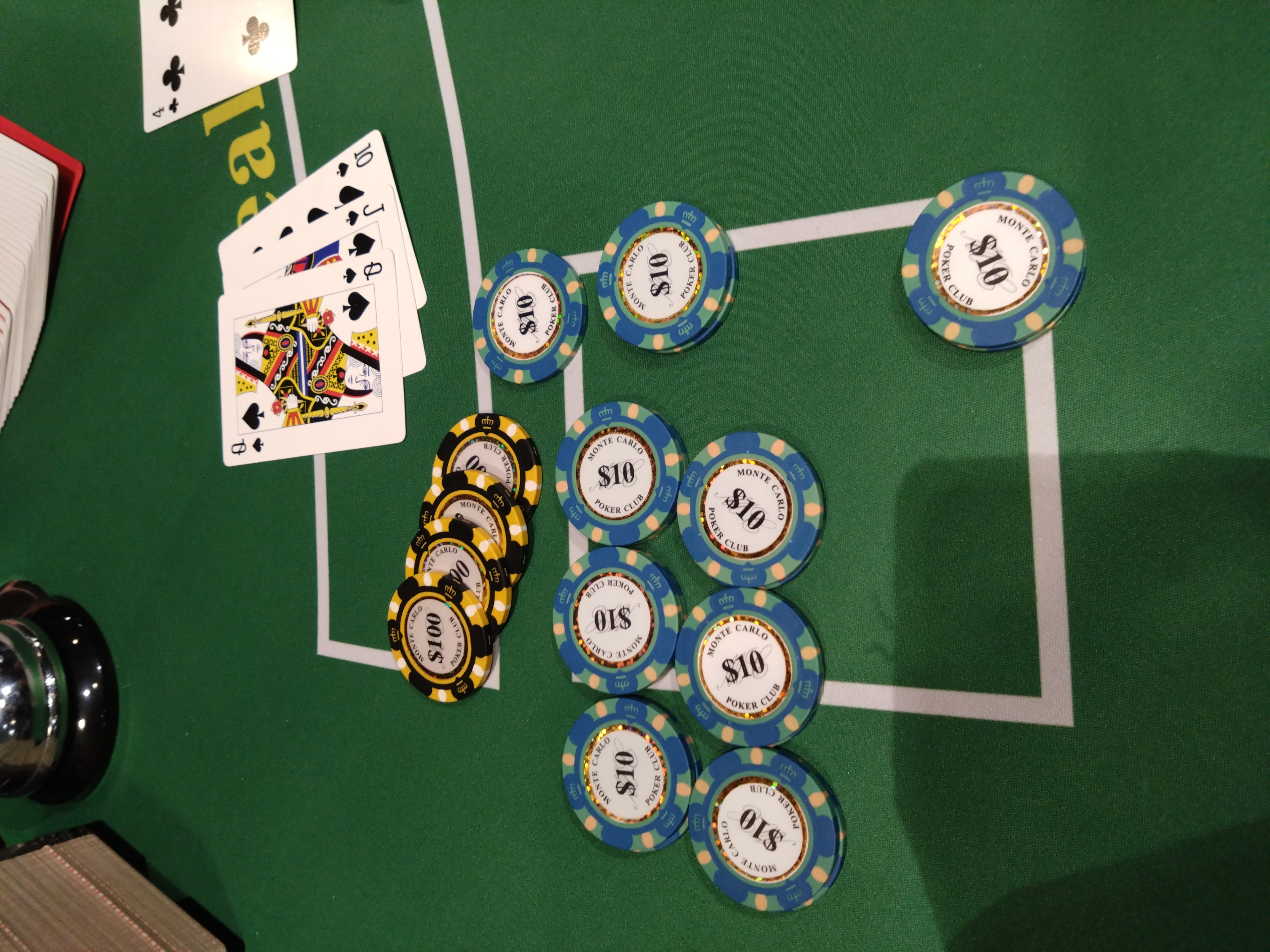 例えばコミュニティカード5枚で『♡フラッシュ』(ストフラ以外)が完成して、プレーヤー手札が『♠️A.♠️10』VSディーラー手札が『♠️K.♠️Q』の場合