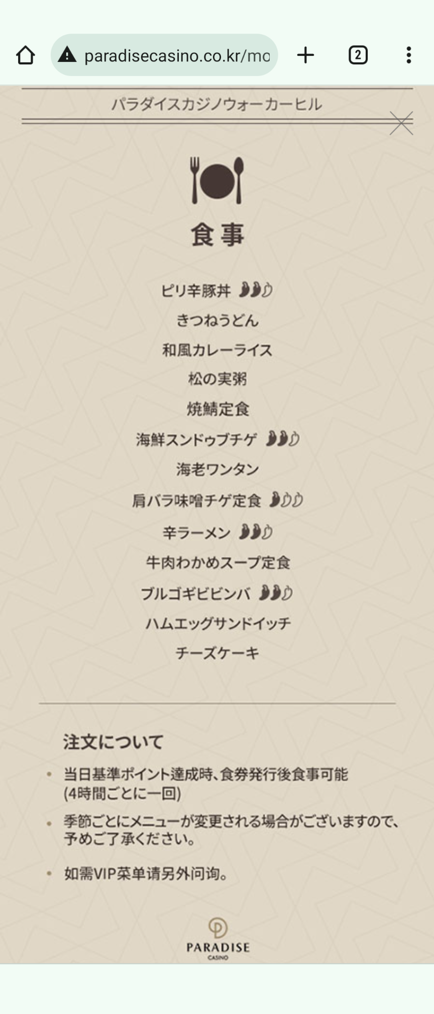 「パラダイスシティ・カジノ」「ウオーカーヒル・カジノ」では、曜日限定ですが、カジノ飯以外にも