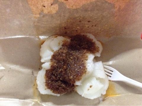 写真のお店は多分お米か何かを濾過して蒸して固形物に固めたものを、甘辛いソースをかけて売ってます。