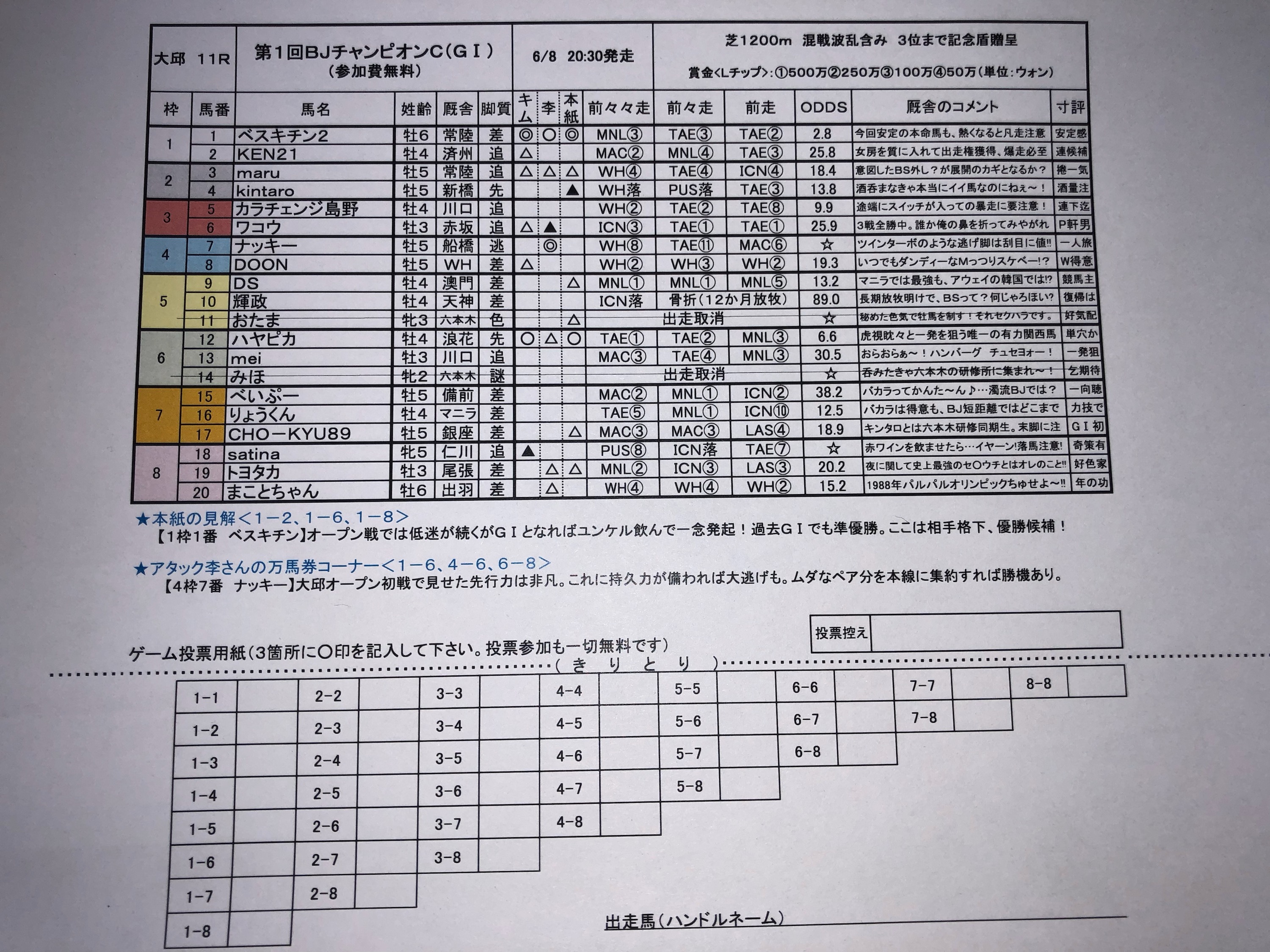 今回のメンバーは、ベスキチン2さん、KEN21さん、まるさん、きんたろさん、CC島野、わこうさん、なっきーさん、DOONさん、DSさん、輝政さん、はやぴかさん、meiさん、べいぷーさん、りょうくん、CHO-KYU89さん、satinaさん、とよたかさん、まことちゃんの18頭立てフルゲートです(ゲート順)。