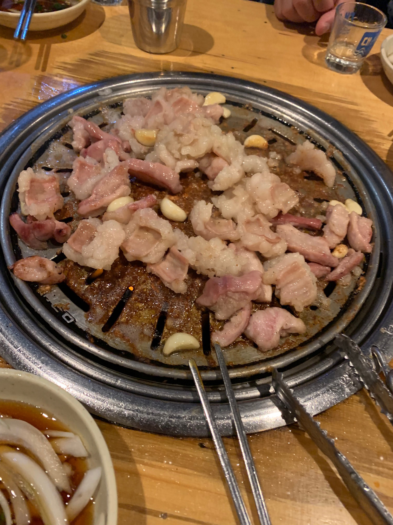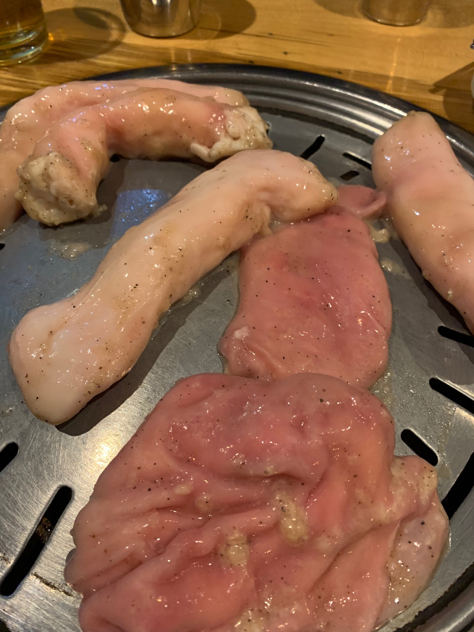 ものが運ばれてきて理解。あとで調べると、テッチャンとマクチャンのホルモン焼きの店らしい。見た目かなりグロい。。うえーって言ってると、隣の女性たちに笑われる。