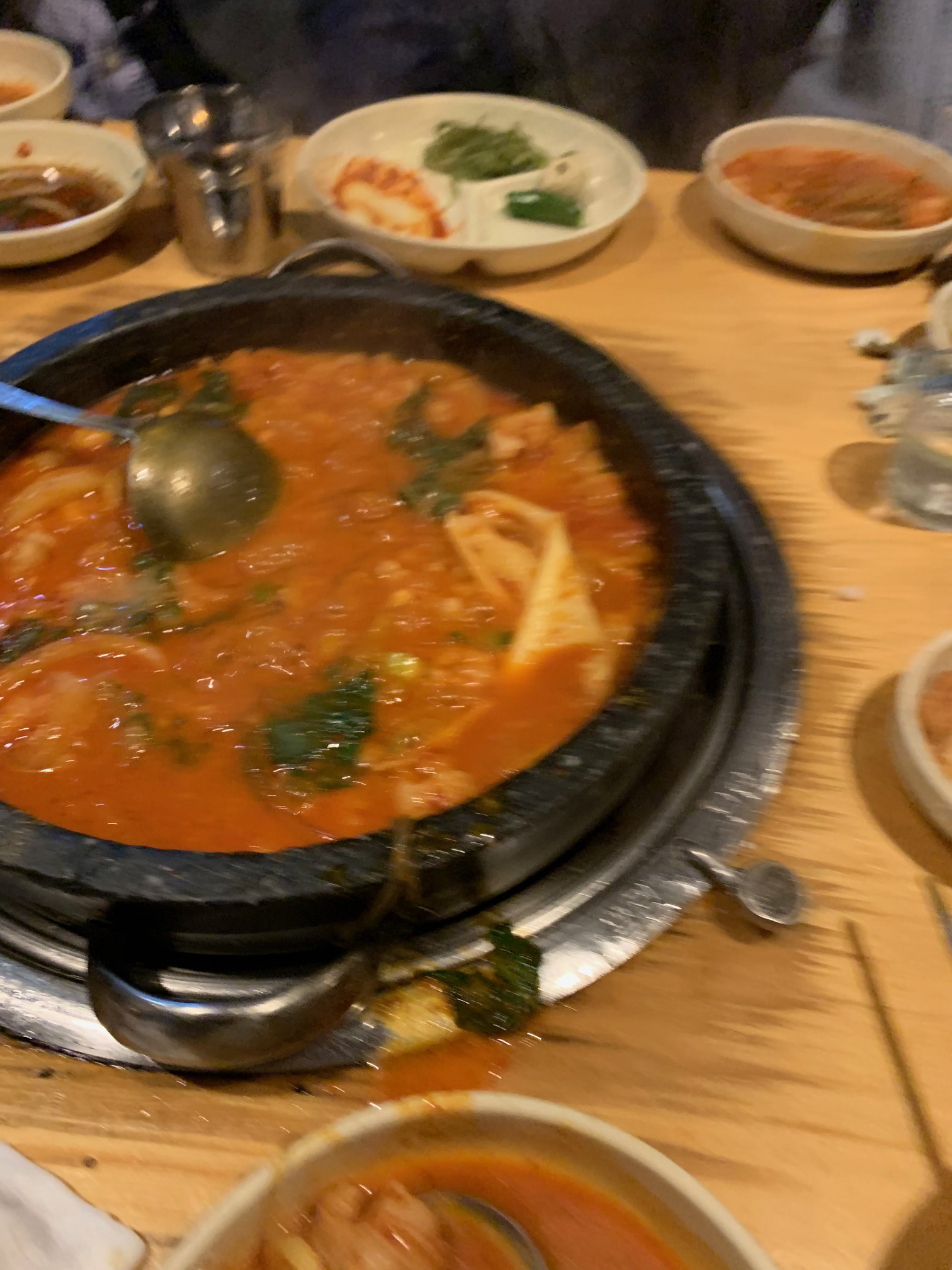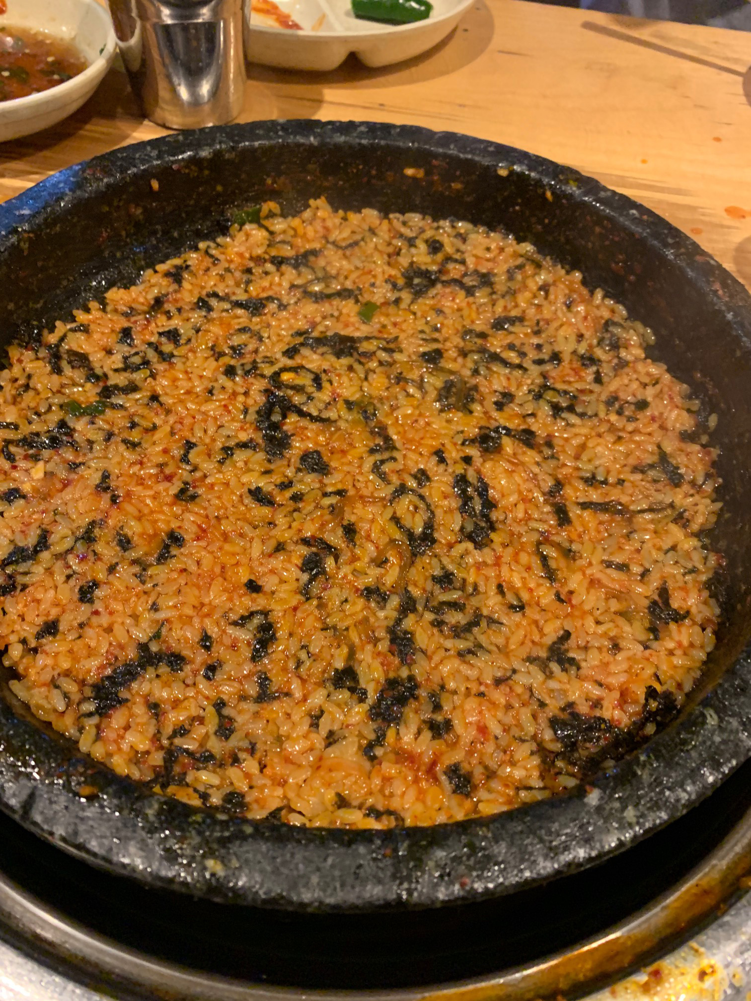 そんなこんなしている間に、運ばれてきた時の何分の一かの大きさになっているホルモン食べるとこれが美味い。隣にも美味い!!っていうと嬉しそう。その後にはさっき私らが頼んだ鍋と焼き飯を頼んだらいい。。と(言葉は理解できなかったがそんな感じ)アドバイス。