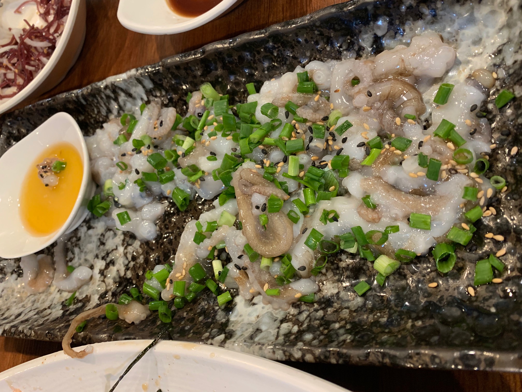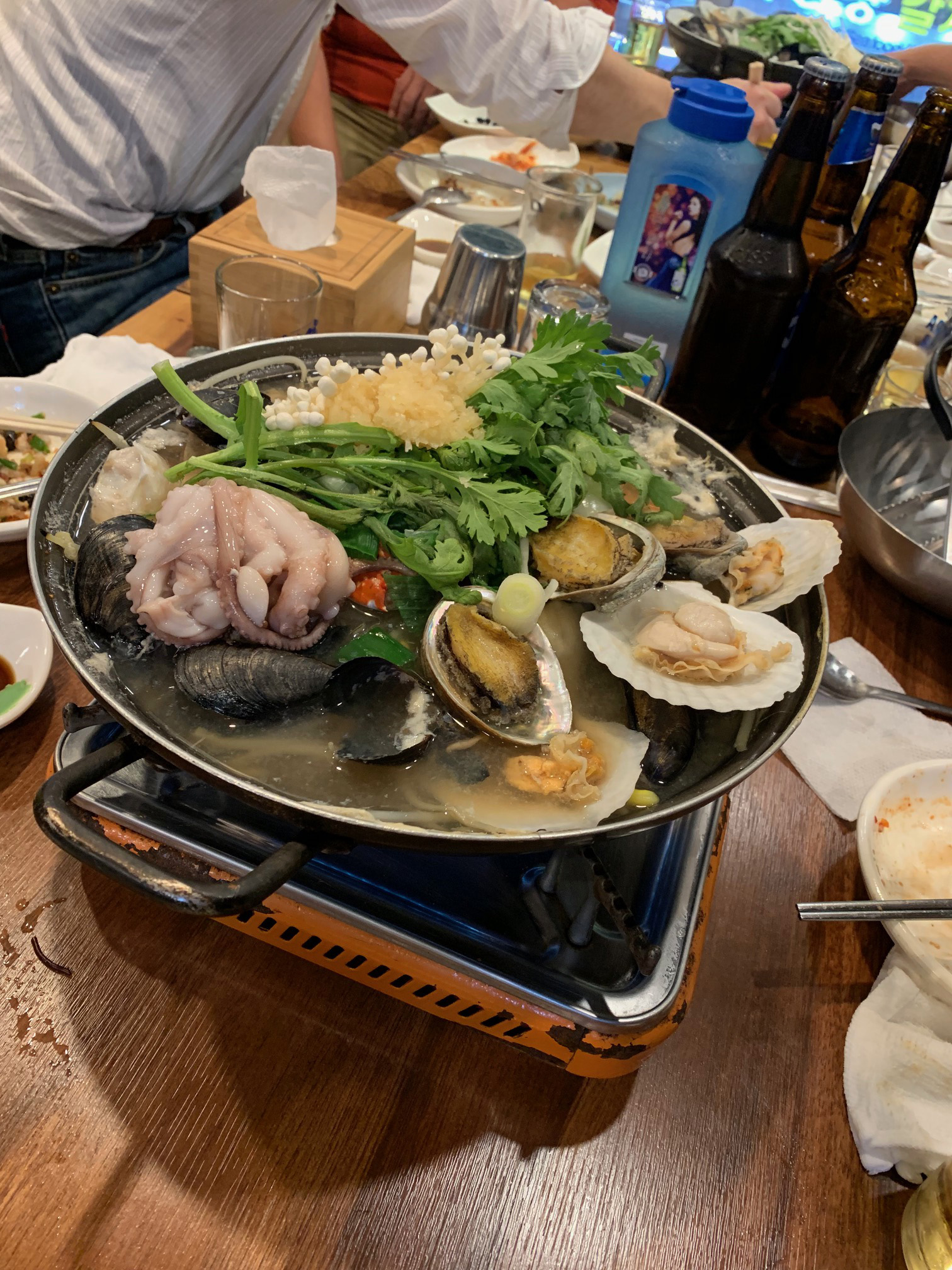 料理は、チヂミから始まりサンナッチ(生ダコ)、それからメインの海鮮鍋です。