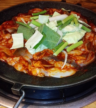 早めの夕食は、弘大のホンスチュクミで辛いイイダコ鍋をたべました。
