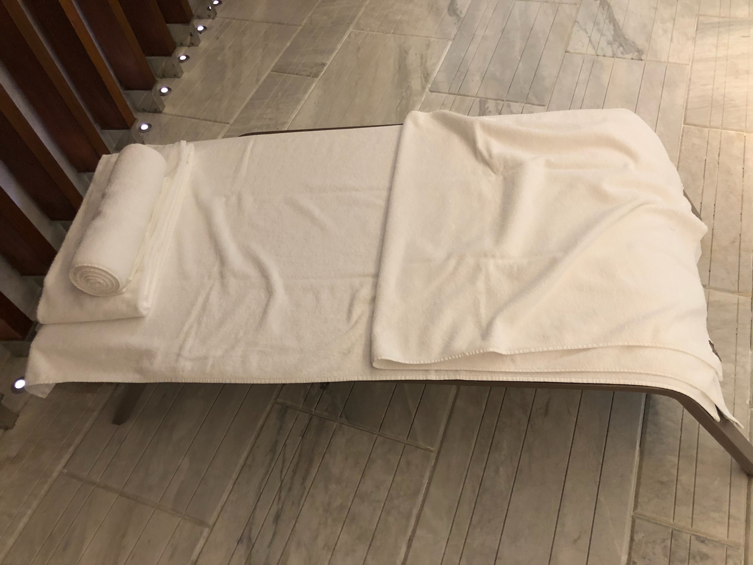 リクライニングをフラットにして、バスタオル3枚を枕と敷布と毛布にして爆睡します。