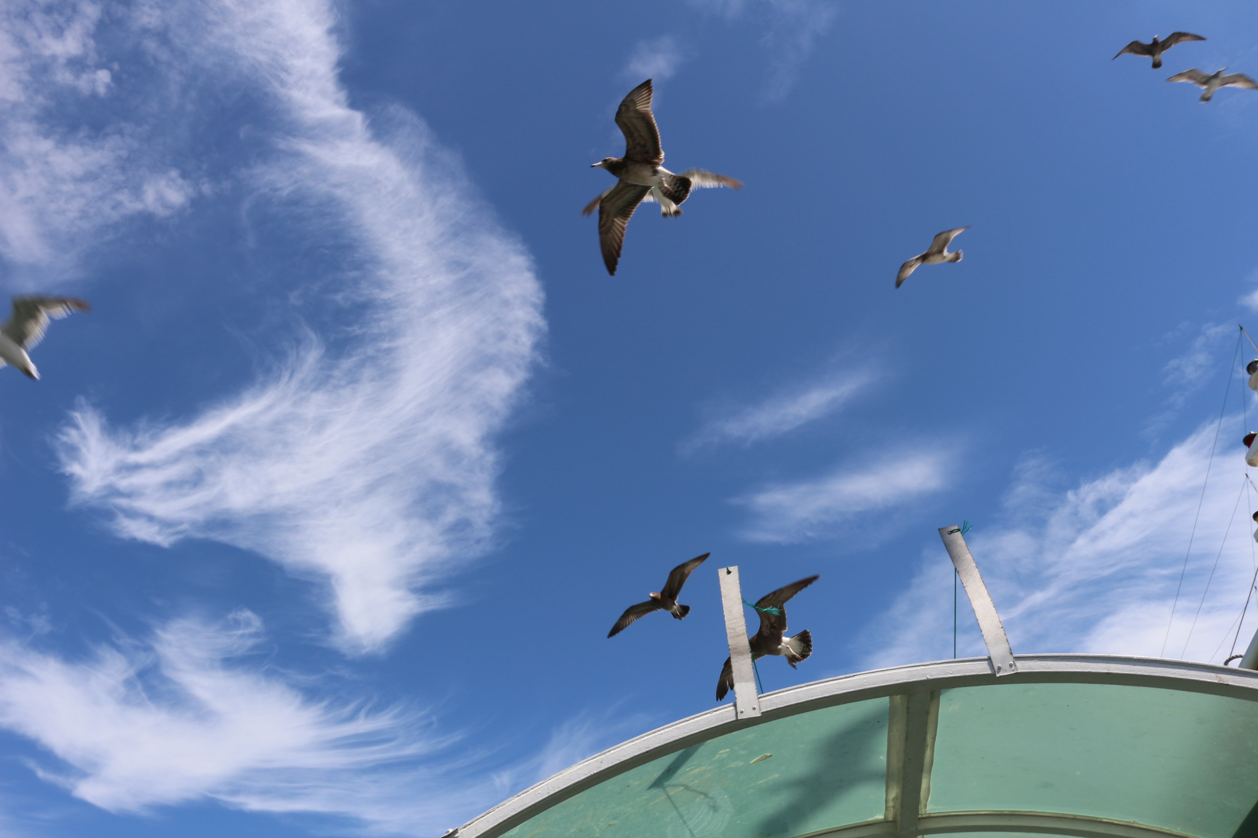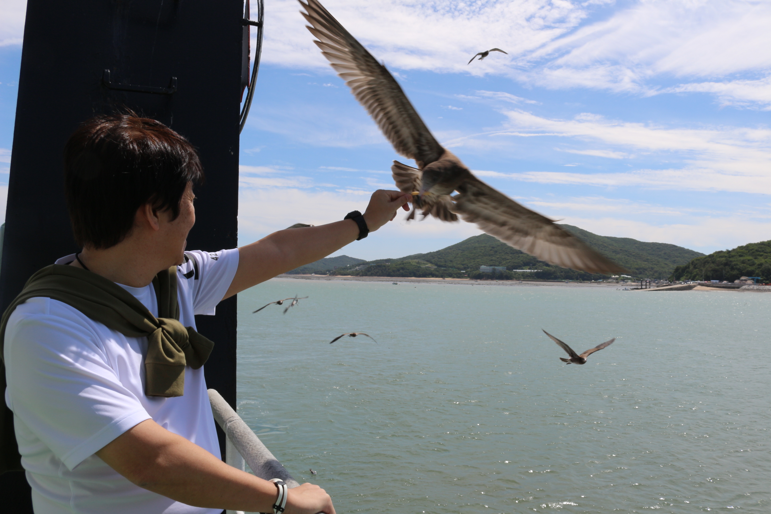 船上でその菓子を持って手を高く上げると、カモメがバサバサーっと飛んできて、空中キャッチしていきます!こんな餌付けも楽しいですねー。