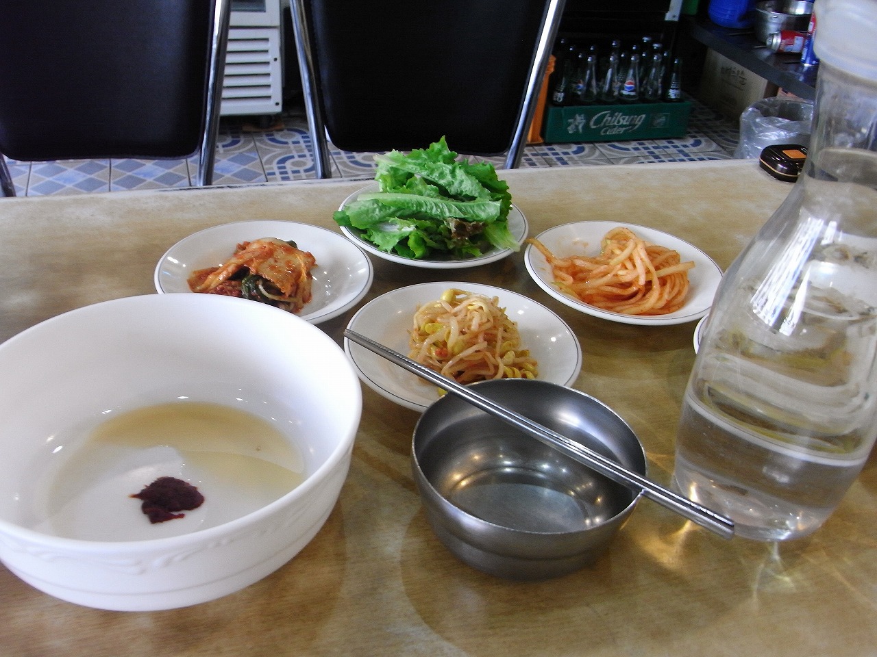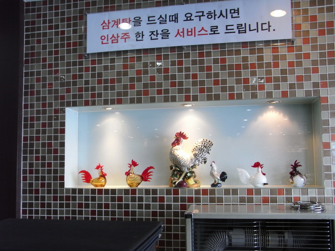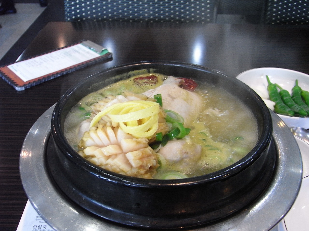 28000ウォンと、アワビ入りは高価です。しかし、大きなアワビが2つ入っていました。24時間営業で、365日やってます。生後40日から49日までの若鳥を使うそうです。背肉はしっかり、あとの部位はとろとろになるまで煮込んであります。隠し包丁のためか、匙で容易にバラバラになります。塩を入れなくても、ダシがよく出ていて、非常に旨い。確かにここの店を推す人が多いのもわかりました。