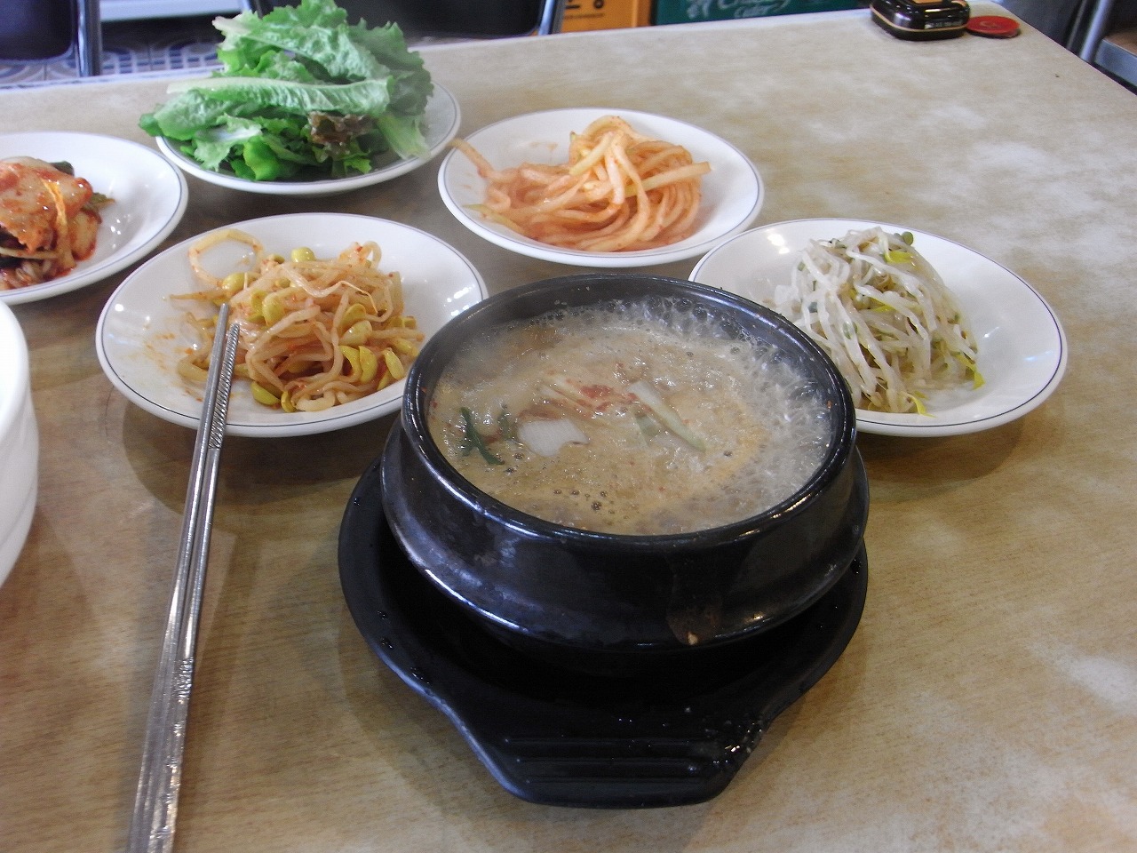 やがてあつあつの鍋がやってきます。思ったより匂いはきつくなく煮豆のような感じでもあります。この店は、おかずがとにかくおいしかったです。納豆が嫌いでなければ、健康的で、こういう朝食も悪くないと思います。7000ウォンでした。