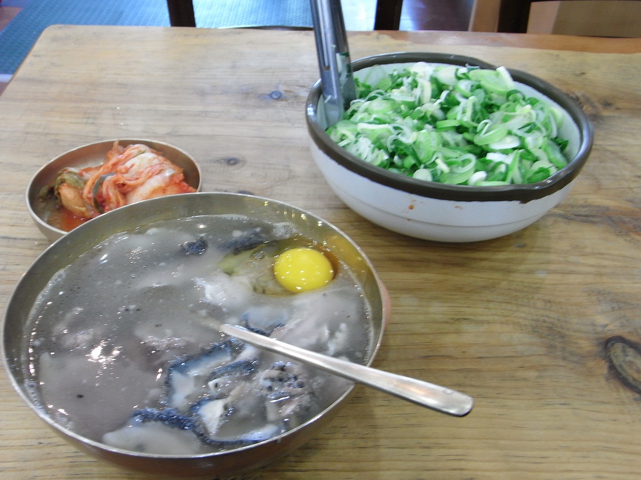 店はすぐわかりました。漢字で「河東館」と看板が出ています。韓国では珍しい食券制で、最初にお金を払います。コムタンには普通と特の2種類がありますが、高い方の特にしました。入っている肉に差があるようです。卵も別料金です。これも頼みます。