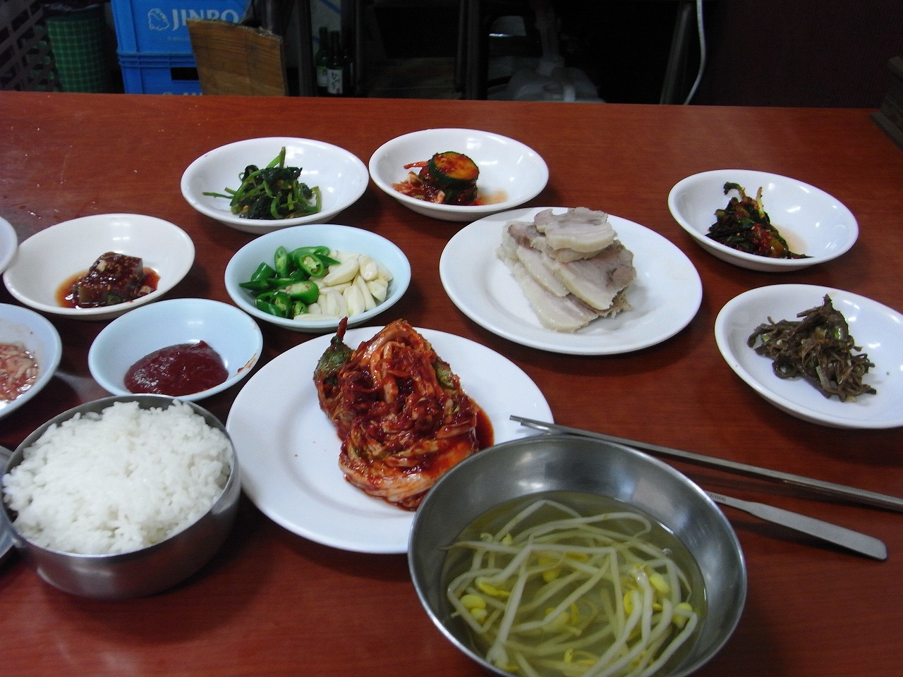 量はかなり多いです。キムチがちょっと濃い目になっているのも、ゆで豚と一緒だとちょうどよくいただけるように計算されている感じです。おかずとしていい具合です。途中でおばさんが「ご飯は足りてる? おかわりは?」と聞いてくれます。言葉はわからないけど、「パッ(ご飯)」という単語で、そう言ってくれてるのがわかります。ありがたいけど、とてもとても入りません。「ありがとう、十分です」と答えて、とりあえずゆで豚は全部やっつけます。