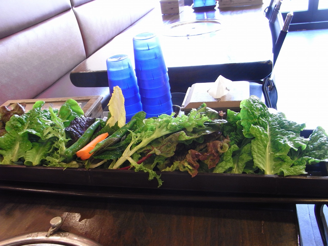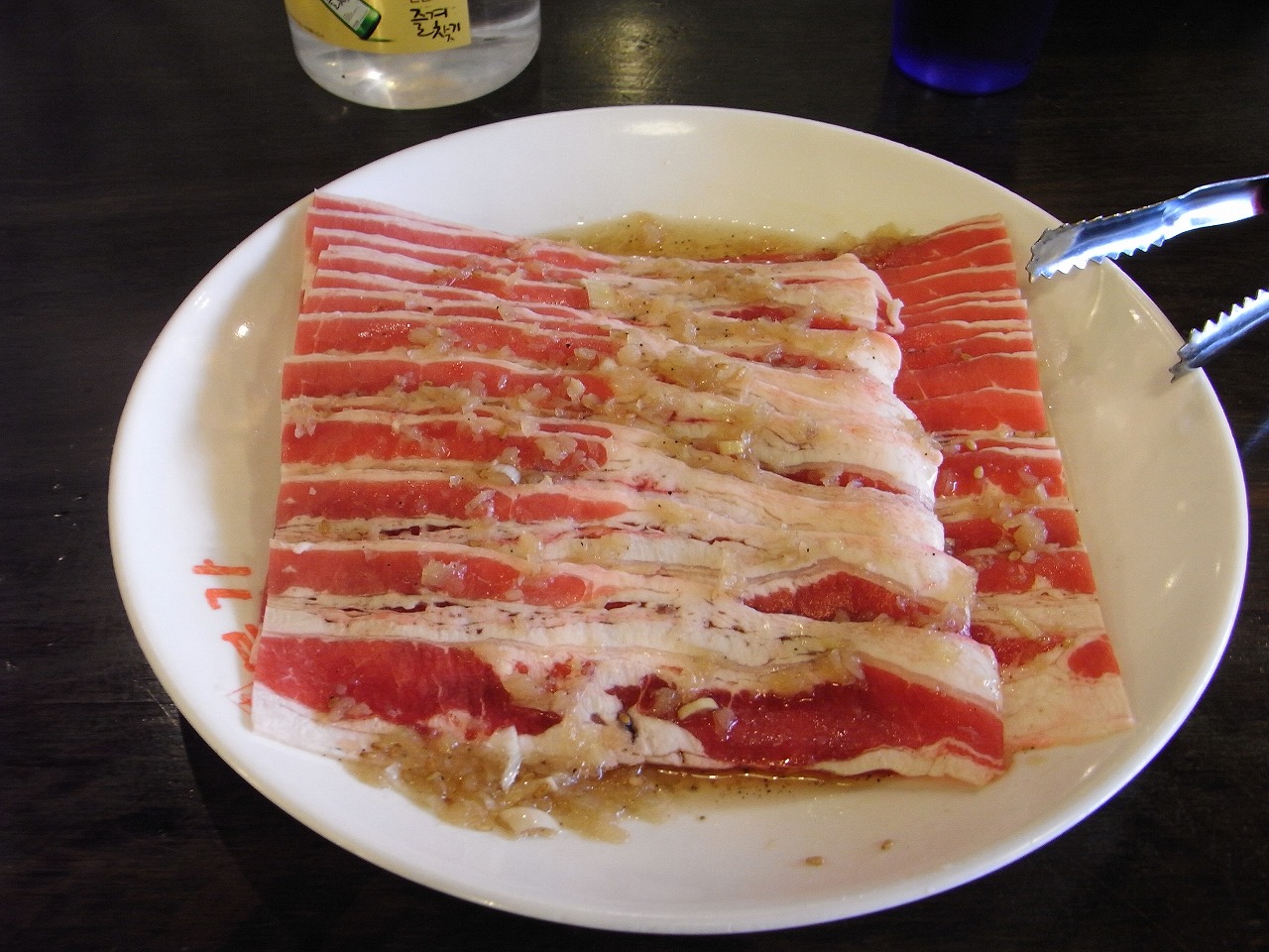 昼はカジノの近く、三成飲食店密集地帯の中の「ポンガ」という所に行きます。「本家」と書きます。ウサムギョッ(牛肉の薄焼きサムギョッサル)が有名な店です。豚よりも上品で軽い感じです。 あっという間に焼けます。牛ならではの旨みと、フルーツなどを使ったタレが上手くからんでいます。これでもか、と野菜が出されます。この野菜で巻いていただくのです。