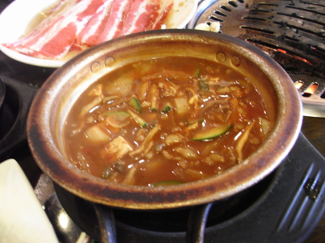 テンジャンチゲや海鮮合わせ味噌(ヘムルサムジャン)も頼みます。「元祖サンパッチッ」にメニューが似た部分があるなと思ったら経営が同じなのでした。道理で野菜が豊富で種類があるはずです。海鮮合わせ味噌が肉と合って旨いです。ソースも独特なもので、いろんなソースや味噌を付けると、いろんな味が楽しめます。