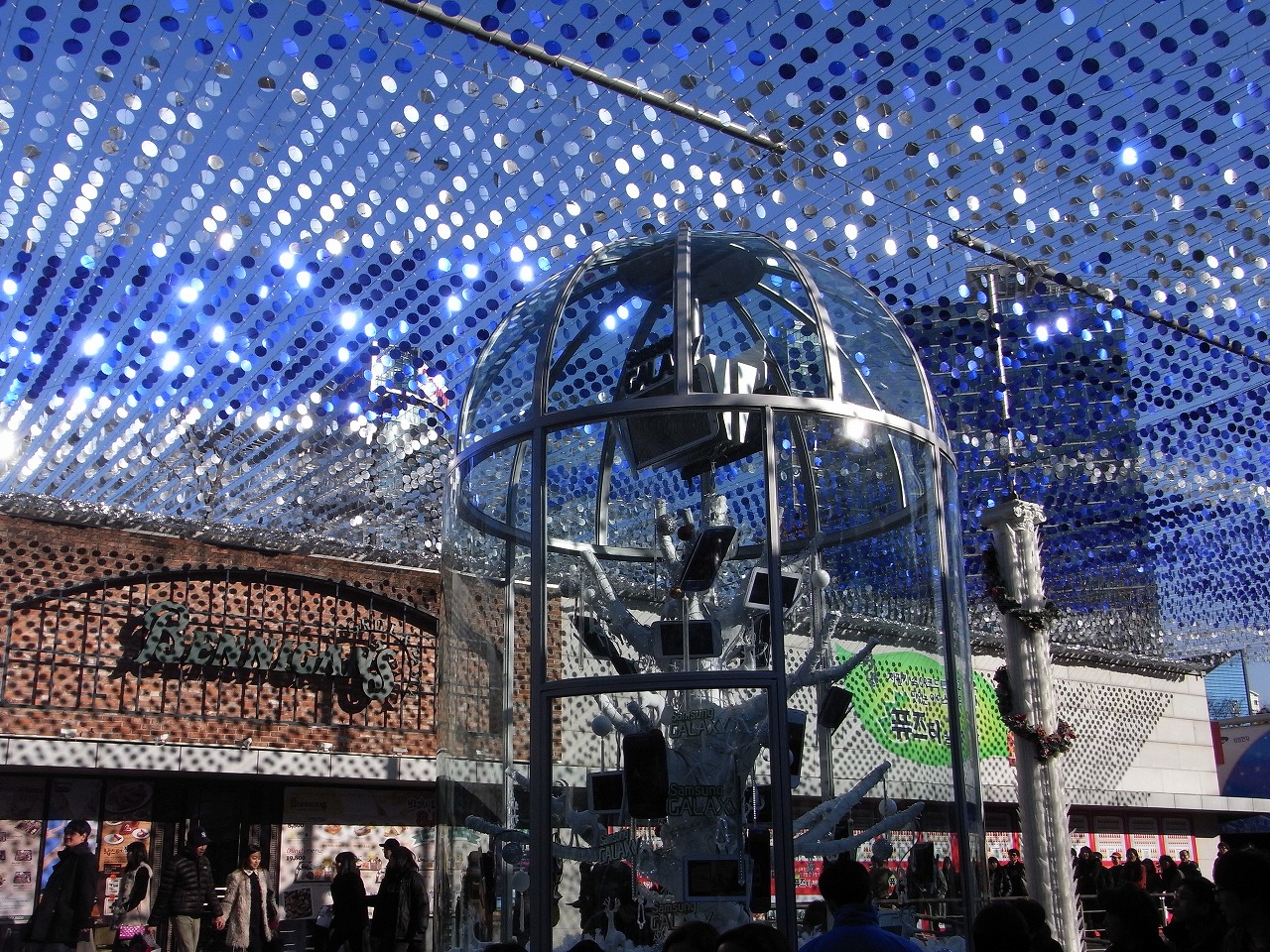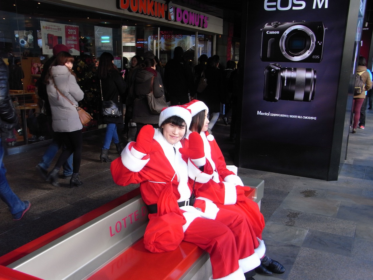 地下鉄でCOEXに向かいます。COEXはたいへんな人出です。飾りつけも、クリスマス色が濃くなっています。サンタの格好をしたキャンペーンガールさんがいます。カメラを向けるとポーズをとってくれました。