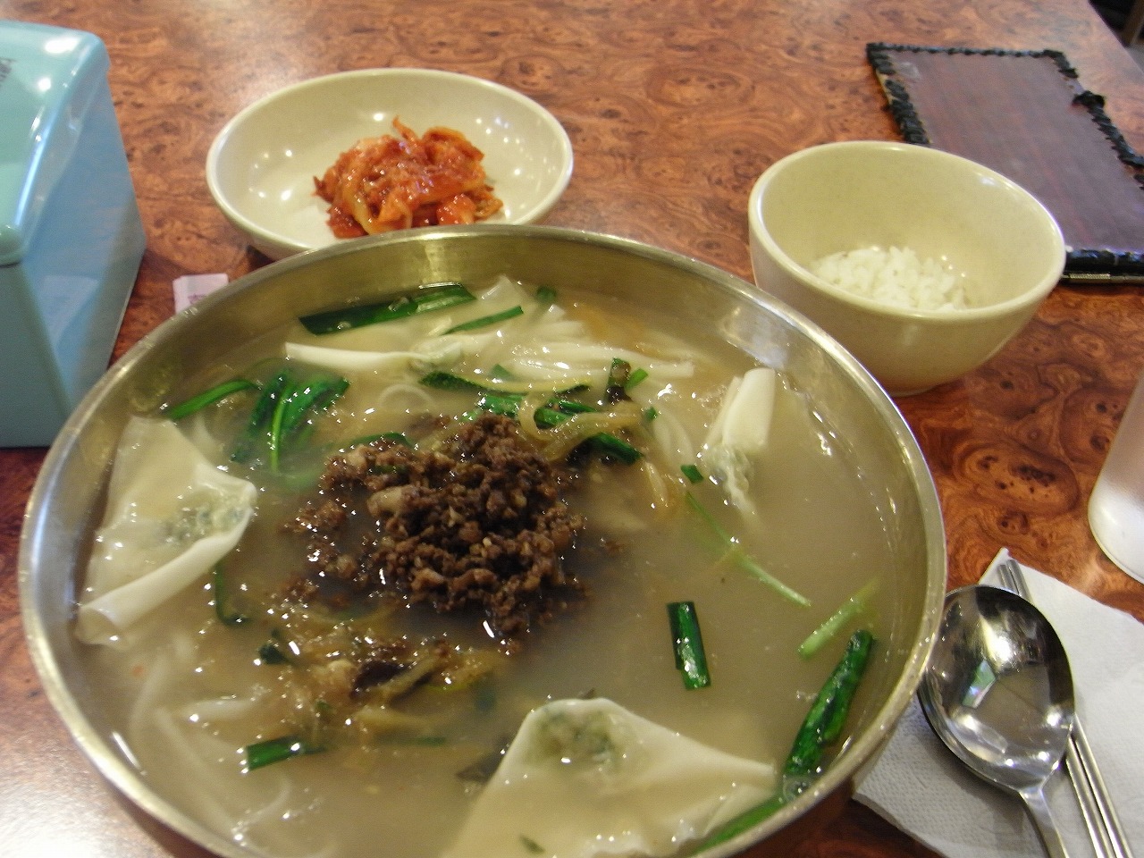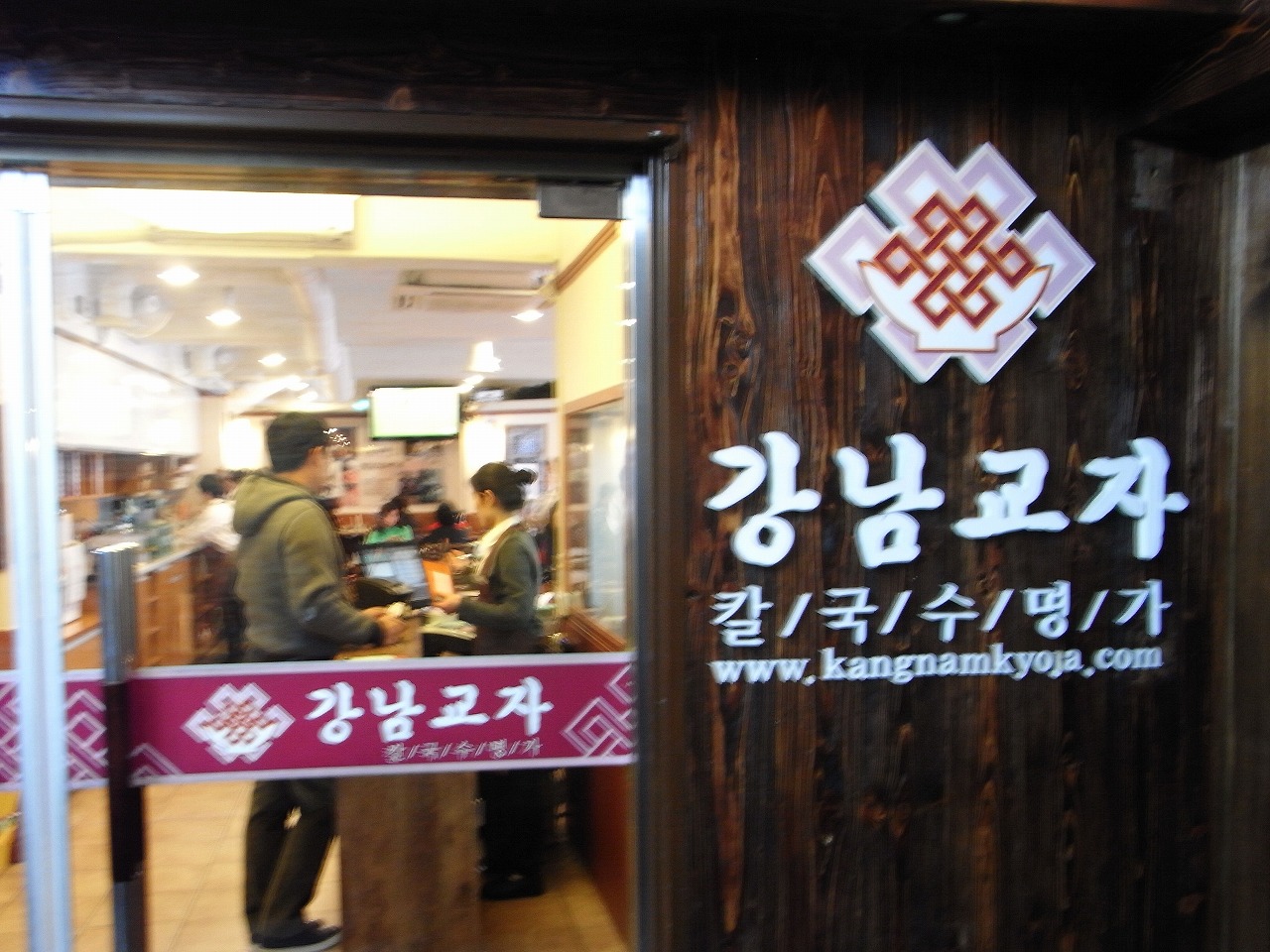 選んだのは「江南餃子」です。地下鉄の江南から歩きます。ここの名物はカルグクス。ほかにはマンドウがあります。自家製の辛い浅漬けキムチも評判です。というと、あれ、と思う方もいらっしゃるかも知れません。ソウルには「明洞餃子」という人気店があります。文字通り明洞にある行列のできる店で、ソウルを旅したことがあれば、行ったことがあるという方も多いと思います。