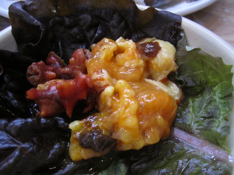 メルジョと呼ばれる塩辛に焼いたお肉をつけて