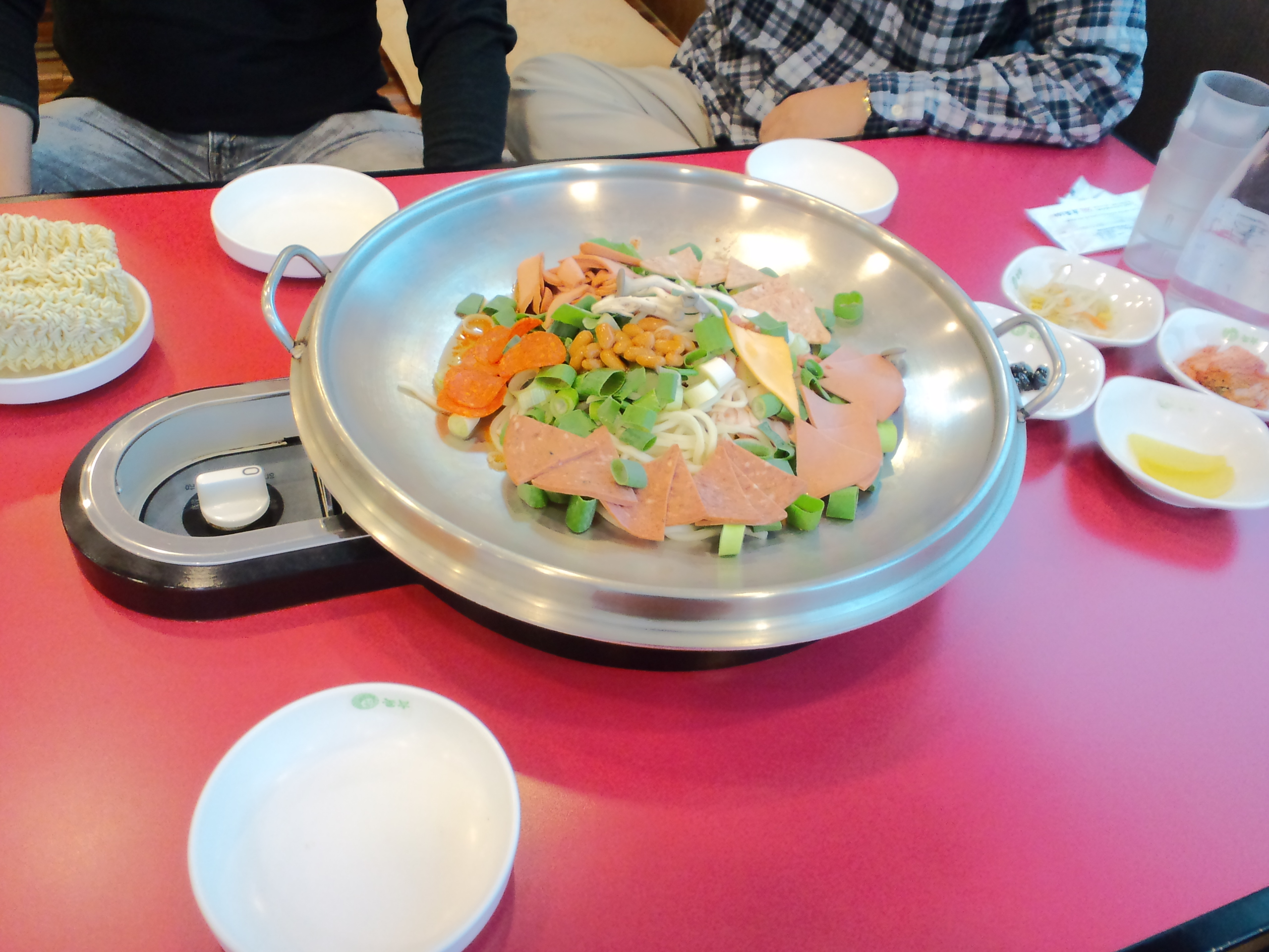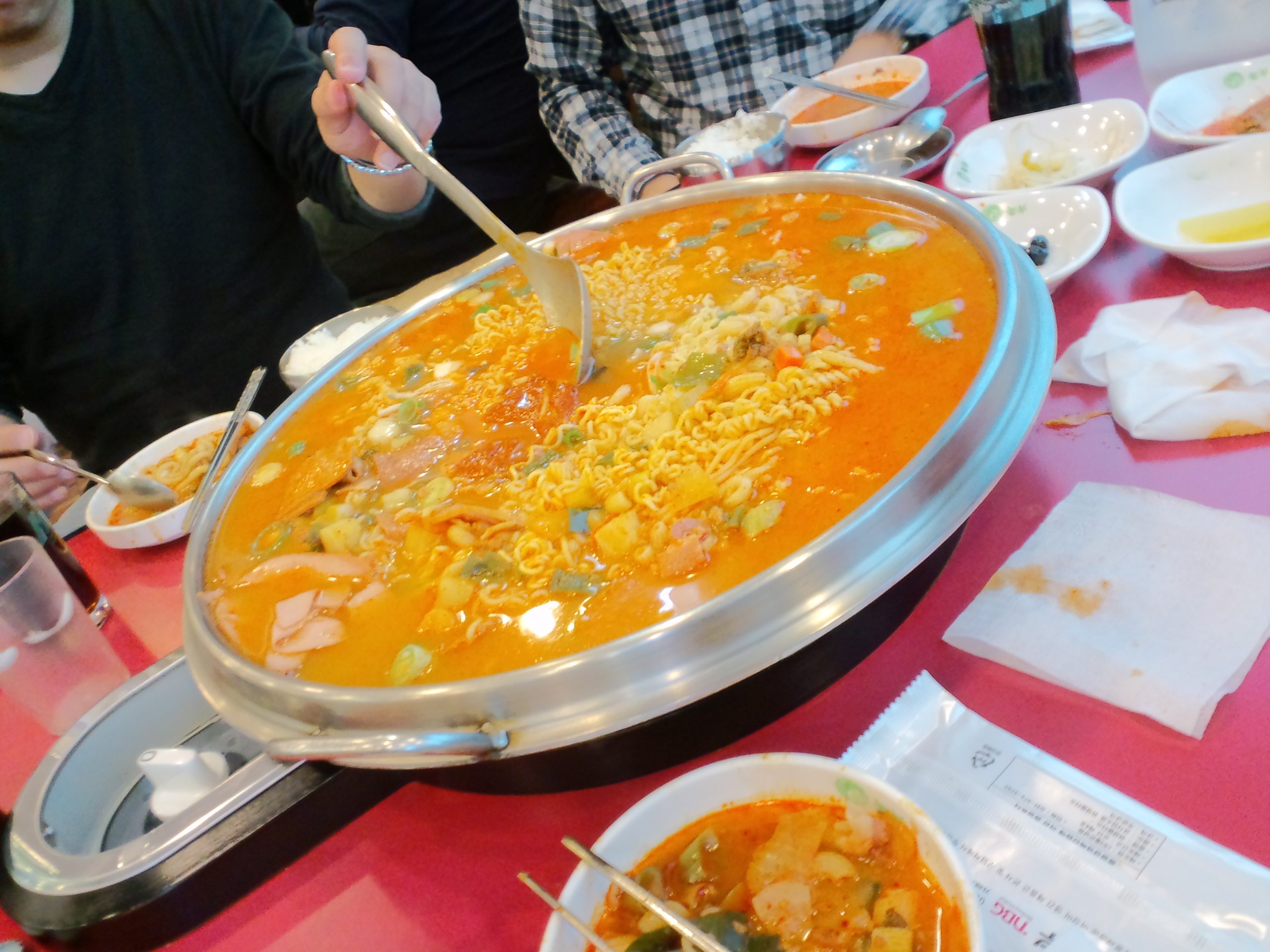 ノルブブデチゲです。スパムやチーズ、ソーセージが入った鍋に麺を投入する辛口鍋。