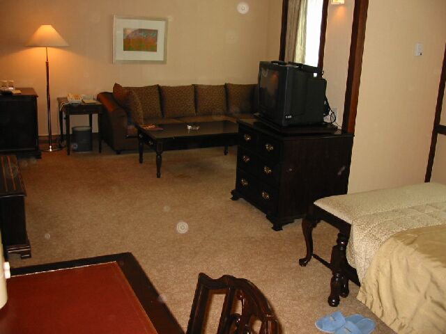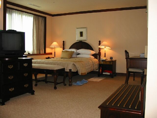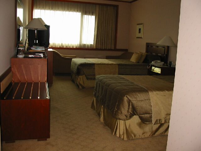 ホテルの部屋はそんなに多くありません。その中でカジノのVIP用のデラックススイートは8部屋ほどで、内2部屋がツインで後はダブルです。この写真は私が泊まった7階に唯一あるスイートで711号室です。多分一番良い部屋だと思います。しかし、ラスベガスのスタンダードといった感じです。ココより高い部屋が2部屋あります。ひとつは2階にある会議用のテーブルのある部屋と,もうひとつは別館(中国人などがツアーで利用する安い部屋のある地下のような所にあるスイートです。しかしこの2部屋はあまり良くないので、カジノの乗客に提供された事はありません。 部屋にはBS(NHK)が写るTVと、冷蔵庫、金庫があります。洗面台のアメニティーは殆どありますが,歯ブラシと歯磨き粉、髭剃りは有料です。あと、スイートには裁縫セットと爪のヤスリがありますが、一般の部屋にはありません。ドライヤーはあります。加湿器はスイートには冬は置いてありますが、一般の部屋にはないので電話すれば持ってきてくれます。