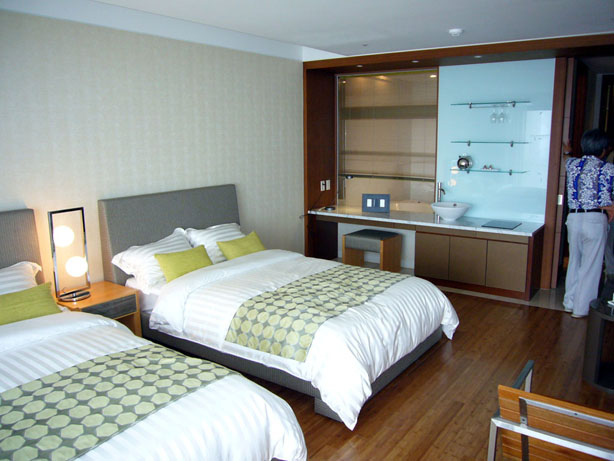 写真で現在確認できるのは、VIP用のお部屋。それも最低レベルの標準モデルだそうだ。それでも十分お洒落でゆったりした部屋でしょ?さらに上のハイローラーには、従来のリゾートが持つコテージ(建坪100坪、3階建て)が提供されるそうな。これもカジ郎がレポートすると思うが、海に開かれた浴室が2つもある超豪華なもの。一度は利用してみたい究極のリゾカジである。