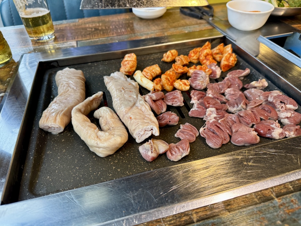 最初はオバチャンが焼いてくれると思って放置していたのですが、途中から自分たちで焼くスタイルのようで、少し焦がしてしまいました。