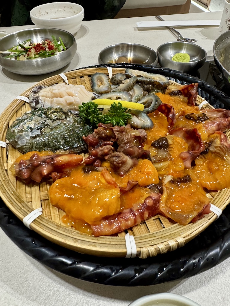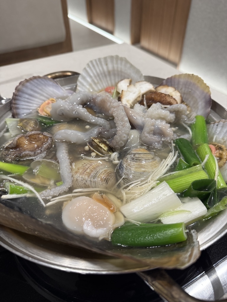 韓国人の販促のお兄さんに選んでもらい、海鮮鍋、アワビのバター焼き、アワビやナマコの刺身を堪能。