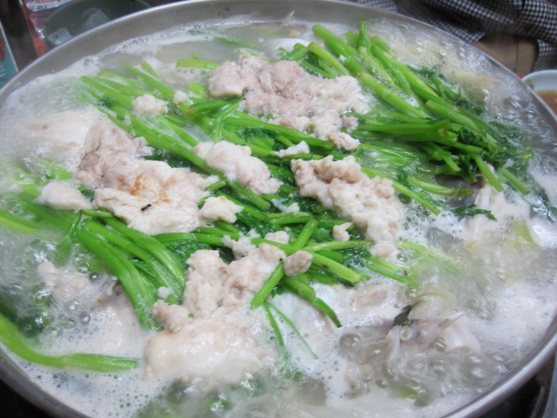 さて、ふぐのお鍋です。お野菜はクレソン(せり)です。