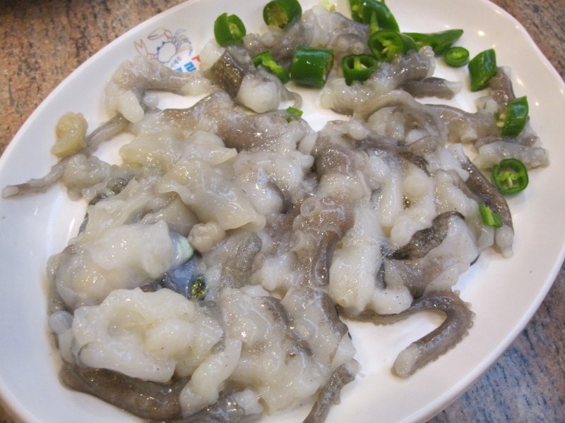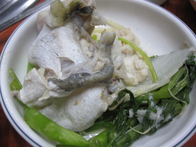 皮も真っ赤に和えてあります。お店のおばちゃんに秘密のアイコンタクトしますと、メニューに無いふぐの白子を出してくれます。(笑)