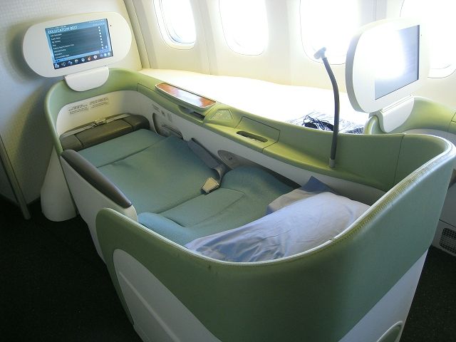 福岡=ソウル線では珍しいフルフラットになるシェルシートでした。