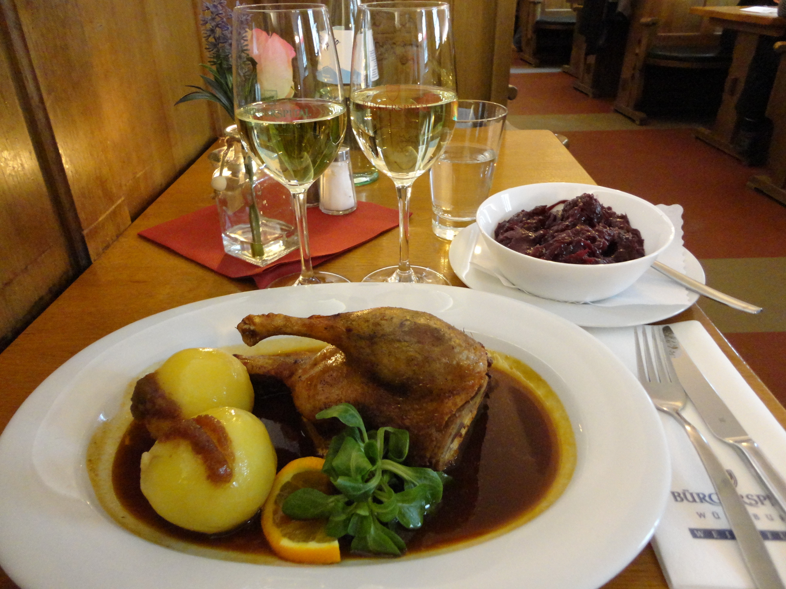 シルバーナーとリースリングのグラスワインを1杯ずつ頼んで、メインは鴨のローストの1/4身を食べた。バイエルン地方の鴨のローストはことのほか旨い。特に皮の部分は絶品。フランケンワインとも良く合って、大満足。