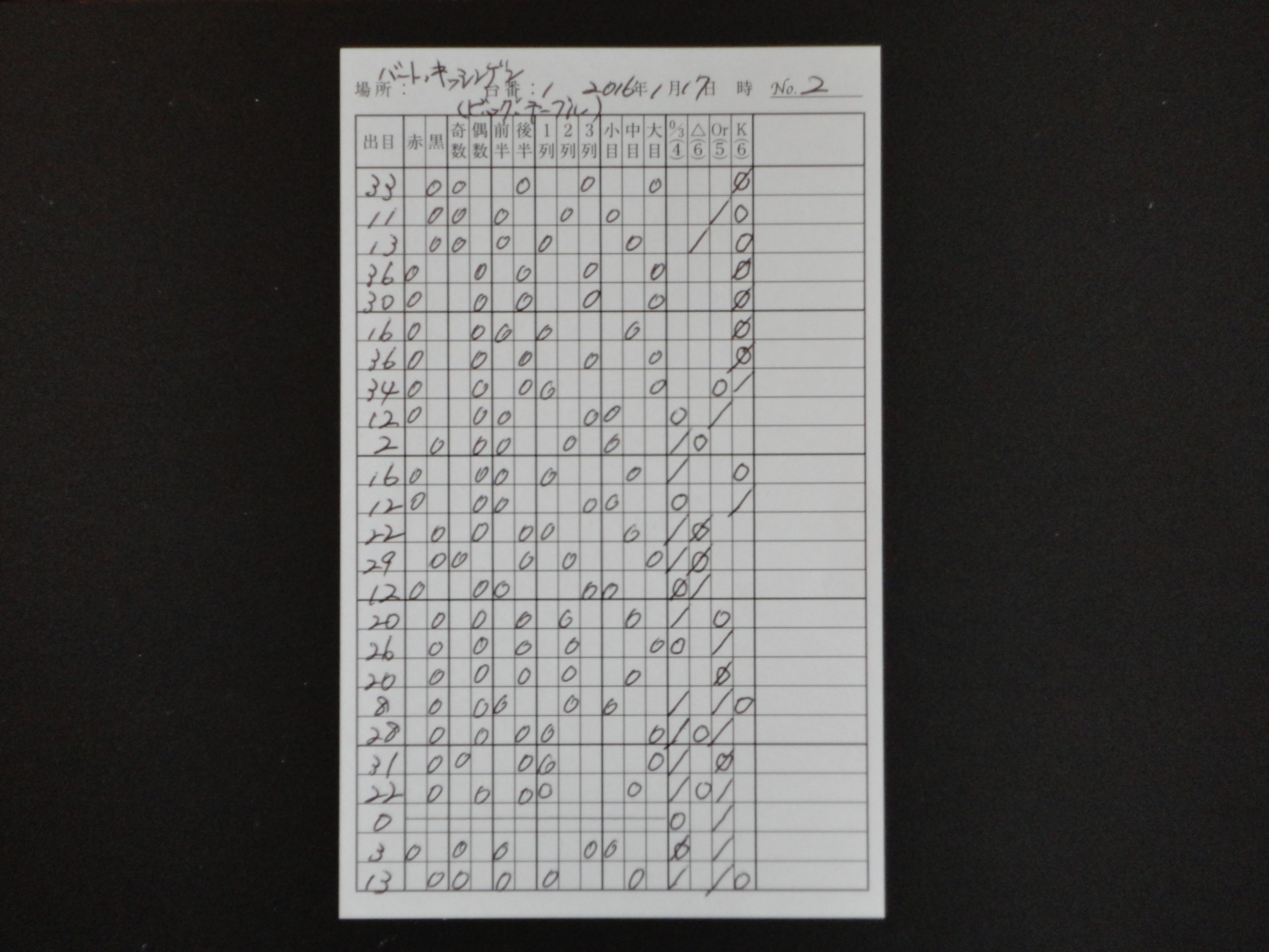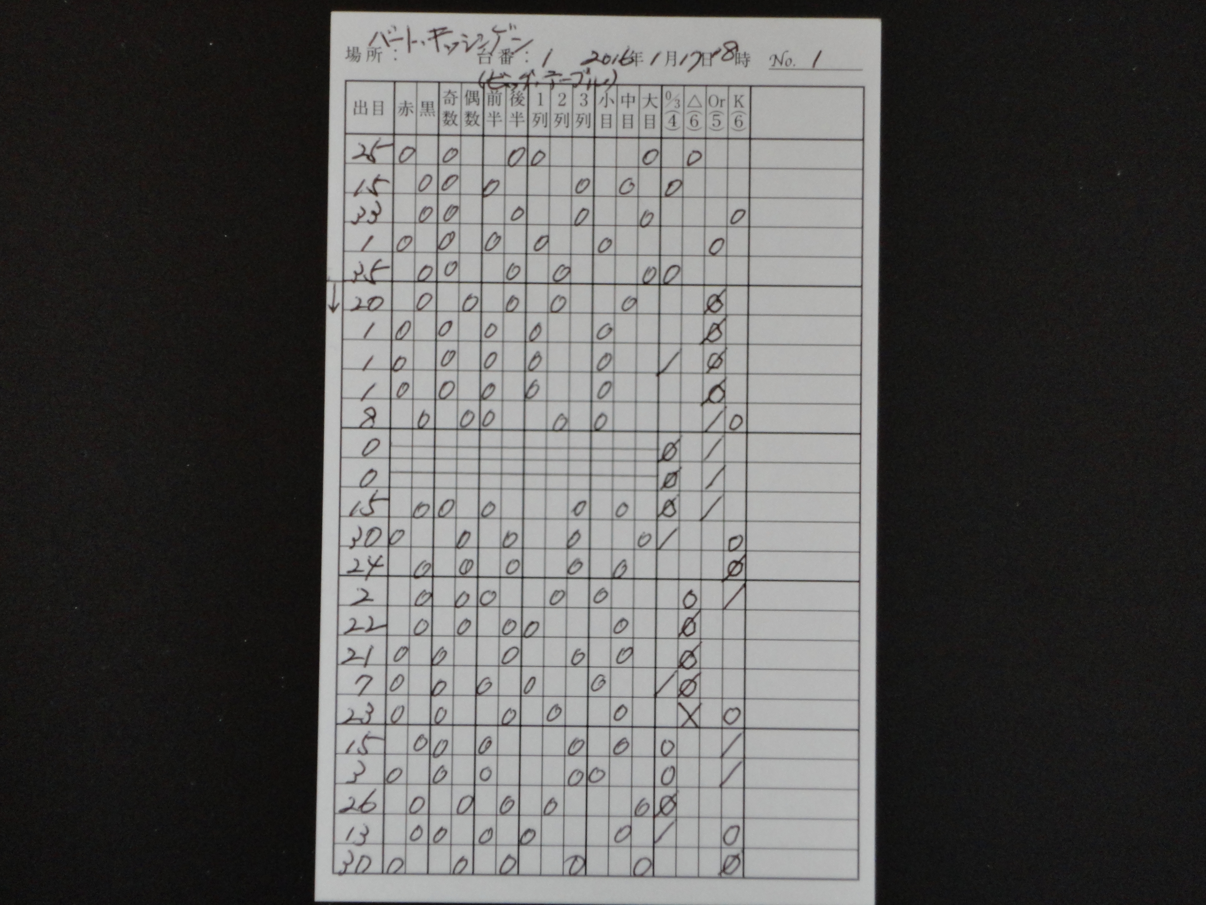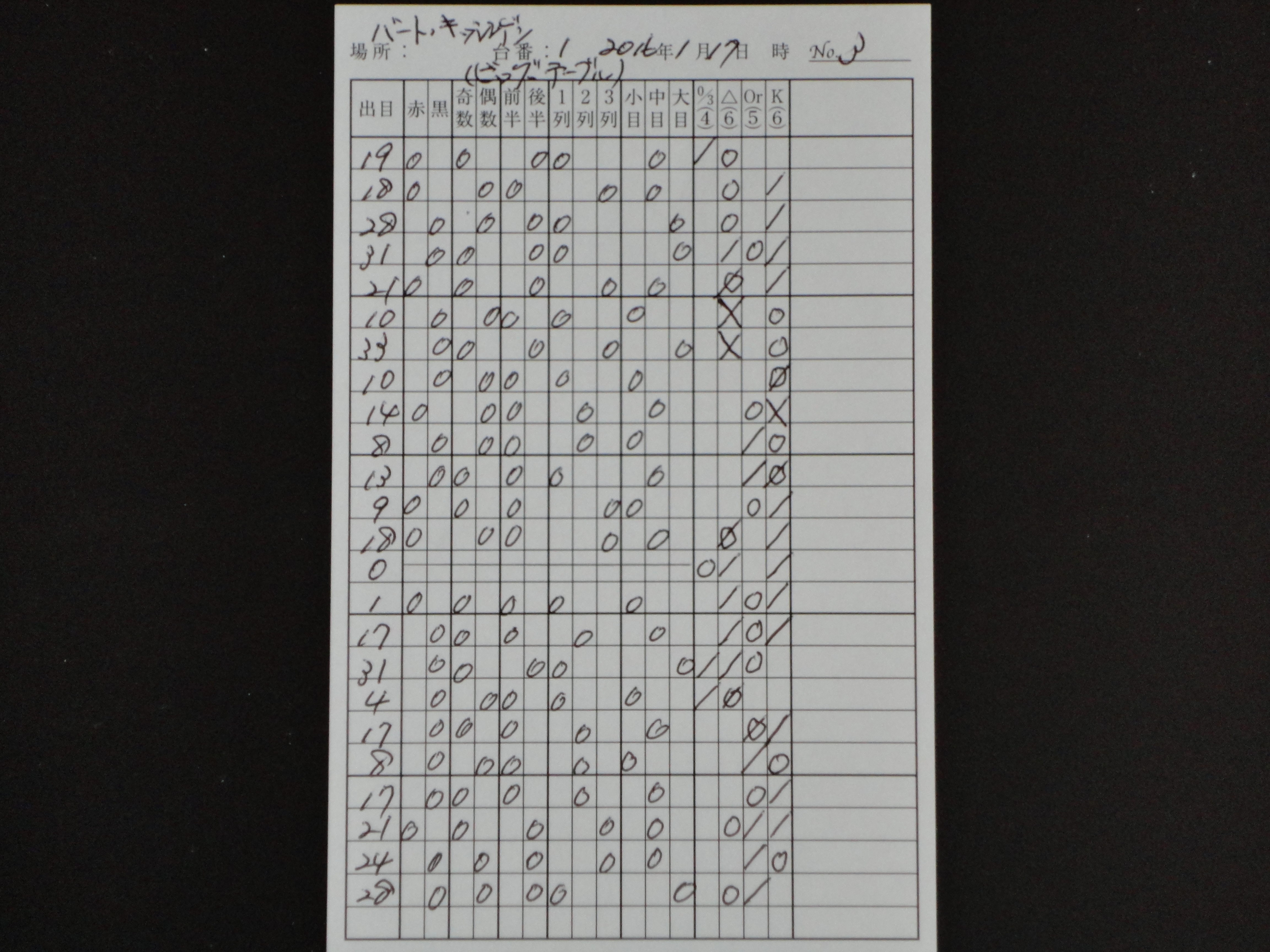 筆者は、ヨーロピアン・ルーレットの37の数字の盤面を4つに分けてゾーンで狙うことを中心に攻めているが、今回はその4つに分けたゾーンでの賭けをわかり易くするために、使用するオリジナルの出目表を作り直した。0/3(ゼロ・スピール)-△-Or(オフラン)-K(クライン・セリー)という流れで記載できるようにしたので、次に出るゾーンの推理がしやすくなった。