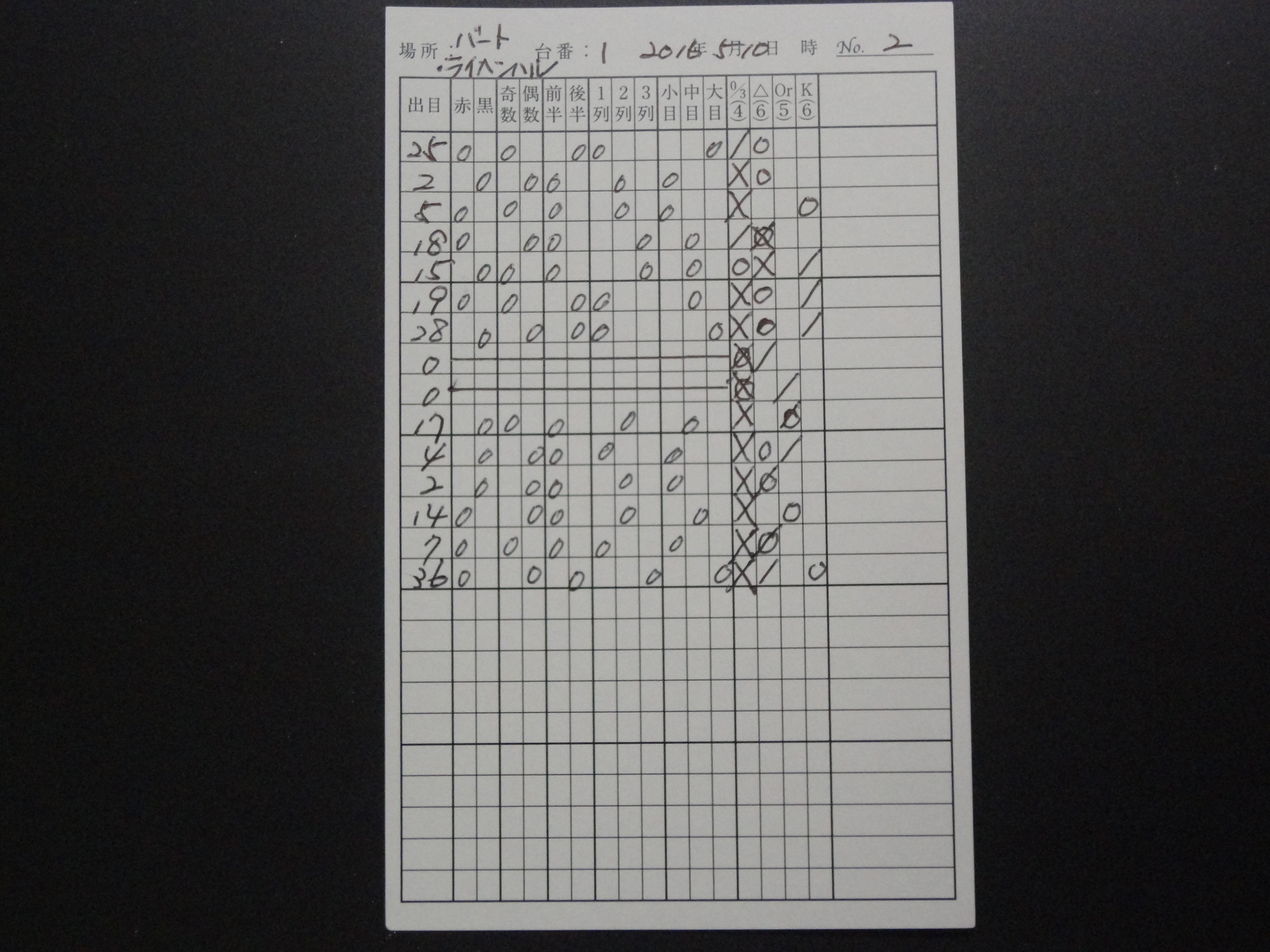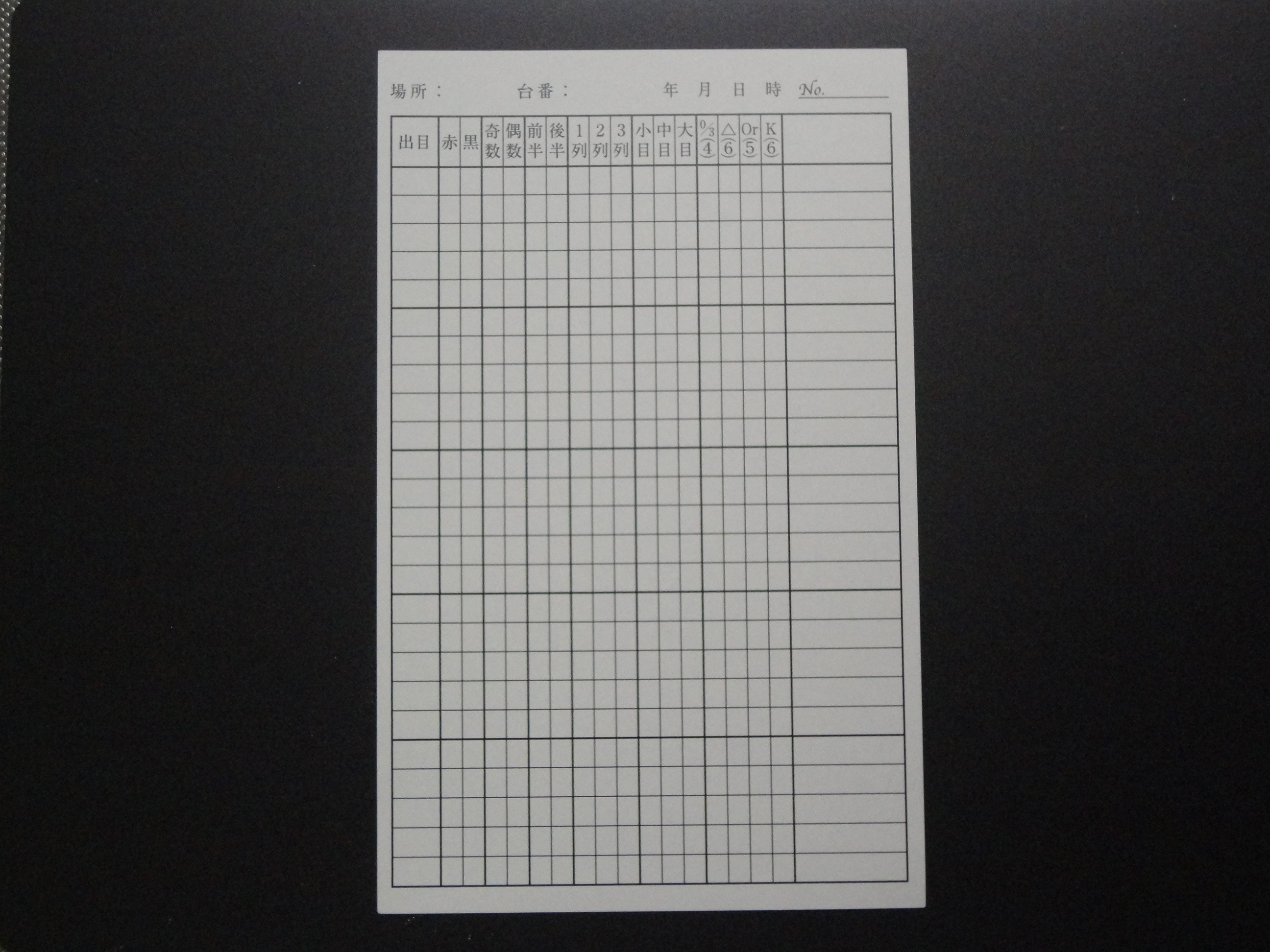 出目表には、ゾーンに賭ける時は当該のゾーンのスペースに斜線を引き(ダブルで賭ける時にはXの形)、実際に出た目の当該のゾーンに○印を記入する。
