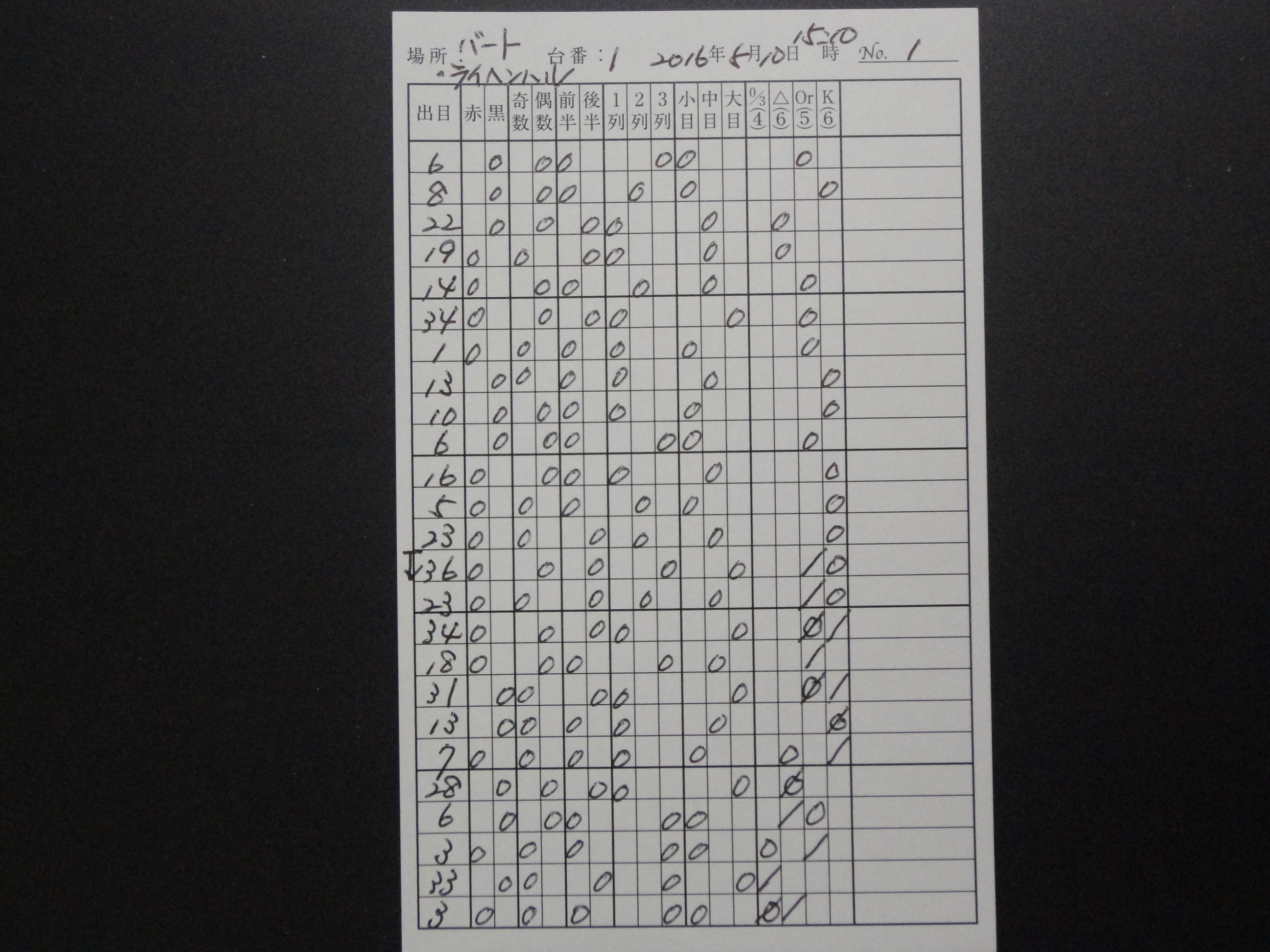 筆者は、ヨーロピアン・ルーレットの37の数字の盤面を4つに分けてゾーンで狙うことを中心に攻めているが、今回はその4つに分けたゾーンでの賭けをわかり易くするために、使用するオリジナルの出目表を作り直した。0/3(ゼロ・スピール)-△-Or(オフラン)-K(クライン・セリー)という流れで記載できるようにしたので、次に出るゾーンの推理がしやすくなった。