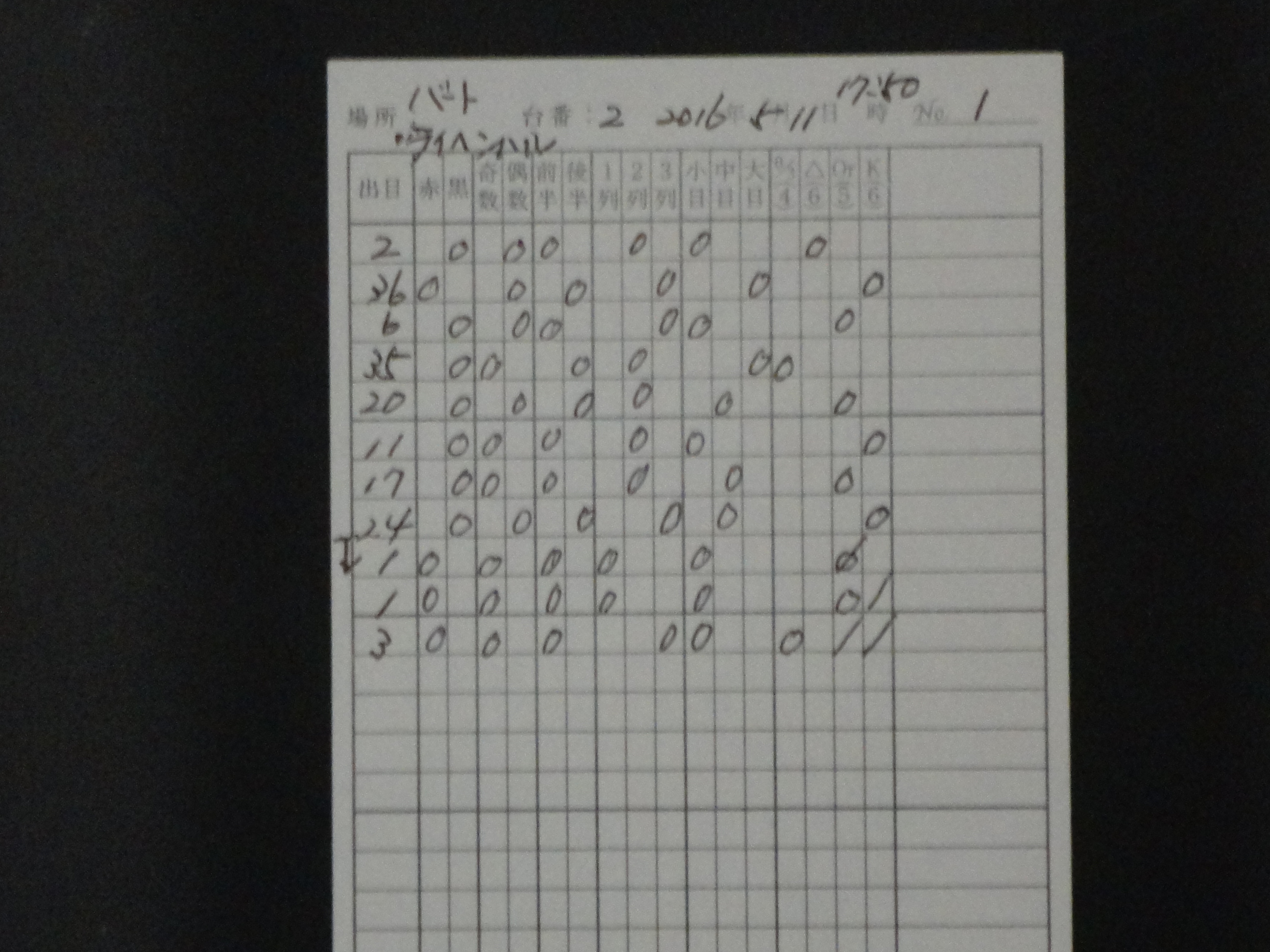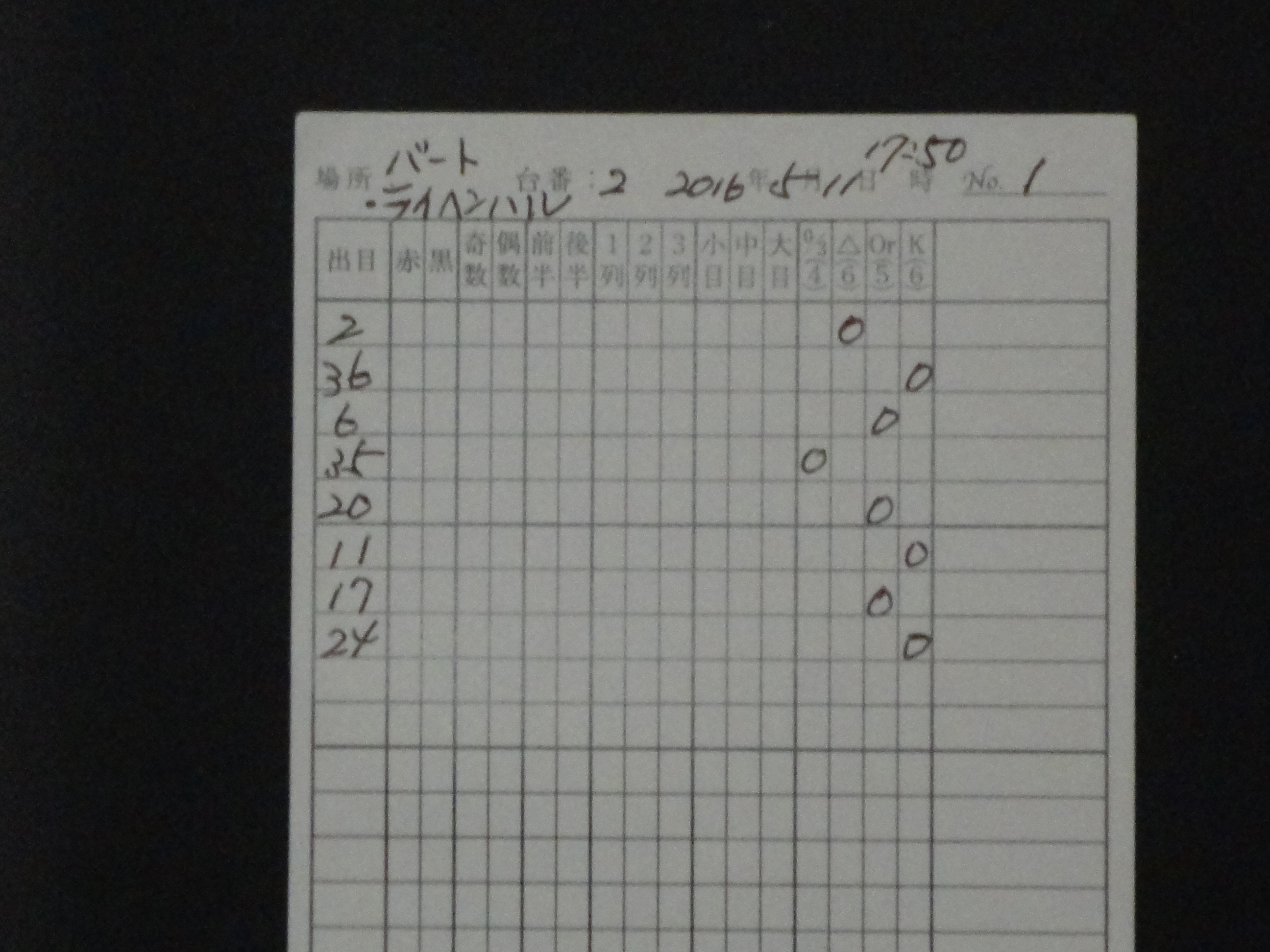 他に賭け人はいないので、出目表に写し終えるまでクルーピエは玉を投げずに待っていてくれている。