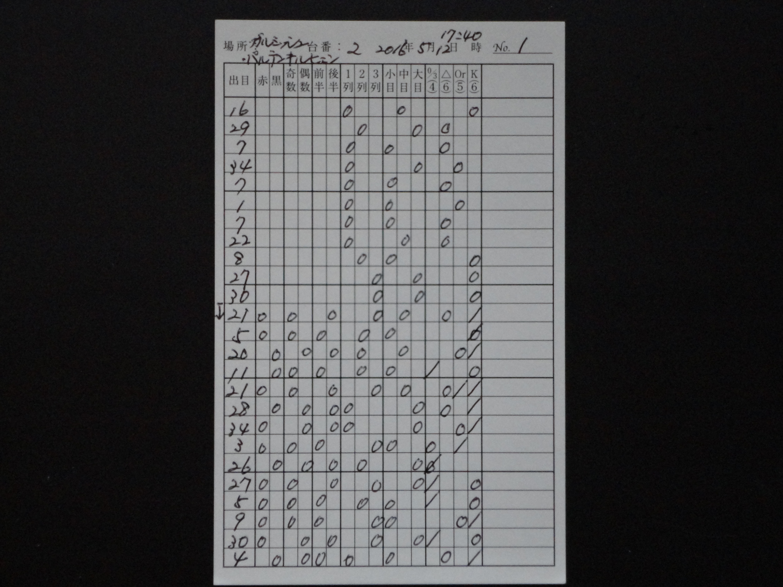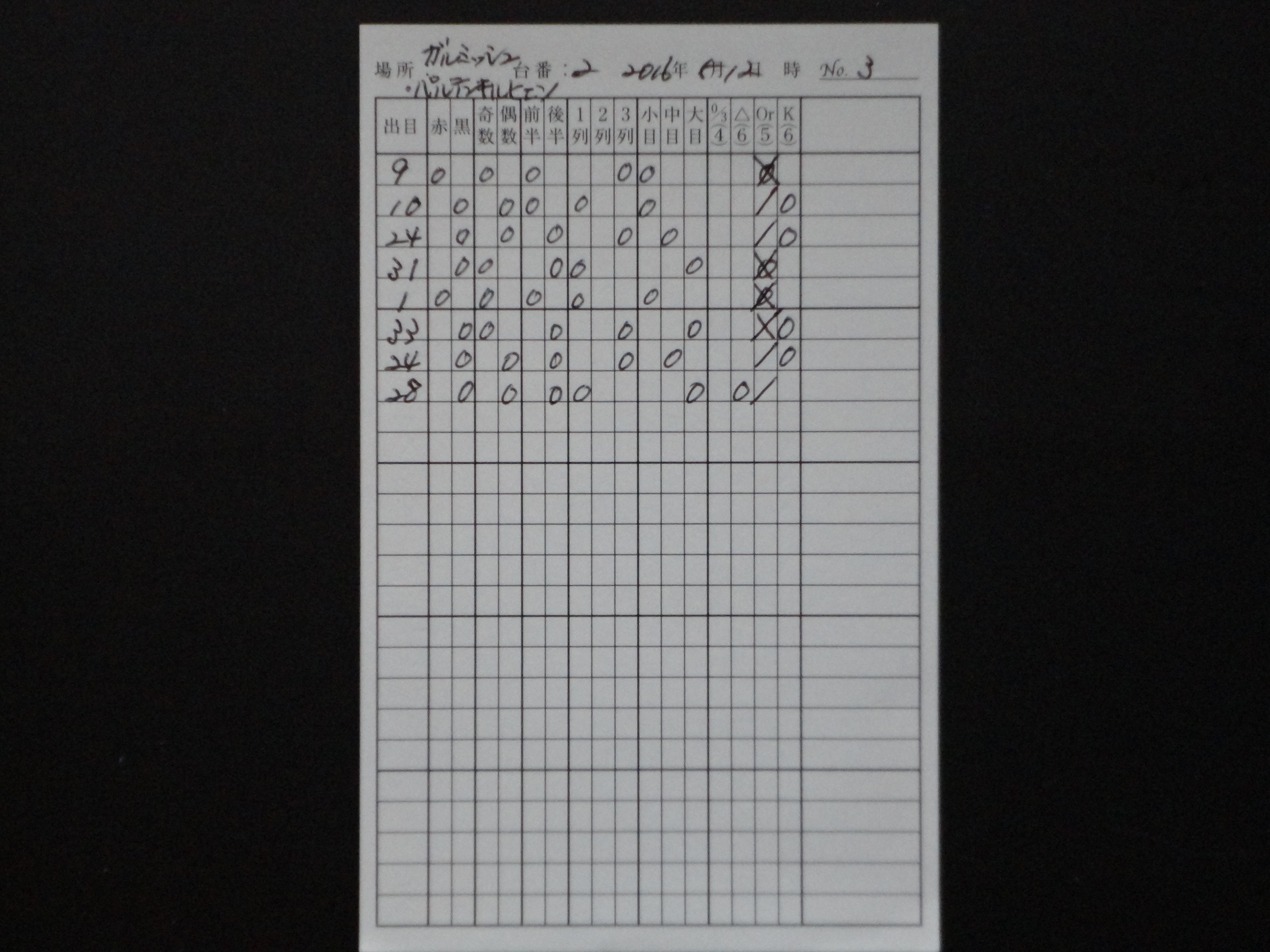 筆者は、ヨーロピアン・ルーレットの37の数字の盤面を4つに分けてゾーンで狙うことを中心に攻めているが、今回はその4つに分けたゾーンでの賭けをわかり易くするために、使用するオリジナルの出目表を作り直した。0/3(ゼロ・スピール)-△-Or(オフラン)-K(クライン・セリー)という流れで記載できるようにしたので、次に出るゾーンの推理がしやすくなった。