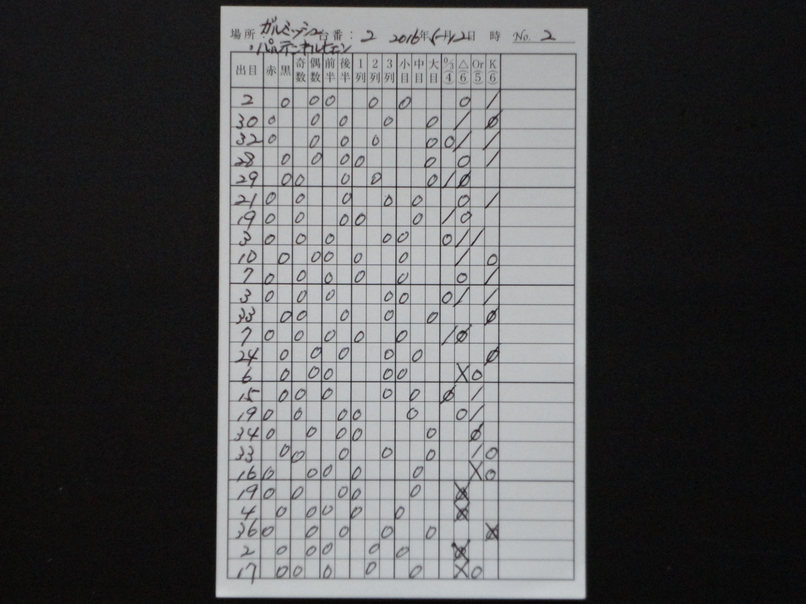 出目表には、ゾーンに賭ける時は当該のゾーンのスペースに斜線を引き(ダブルで賭ける時にはXの形)、実際に出た目の当該のゾーンに○印を記入する。