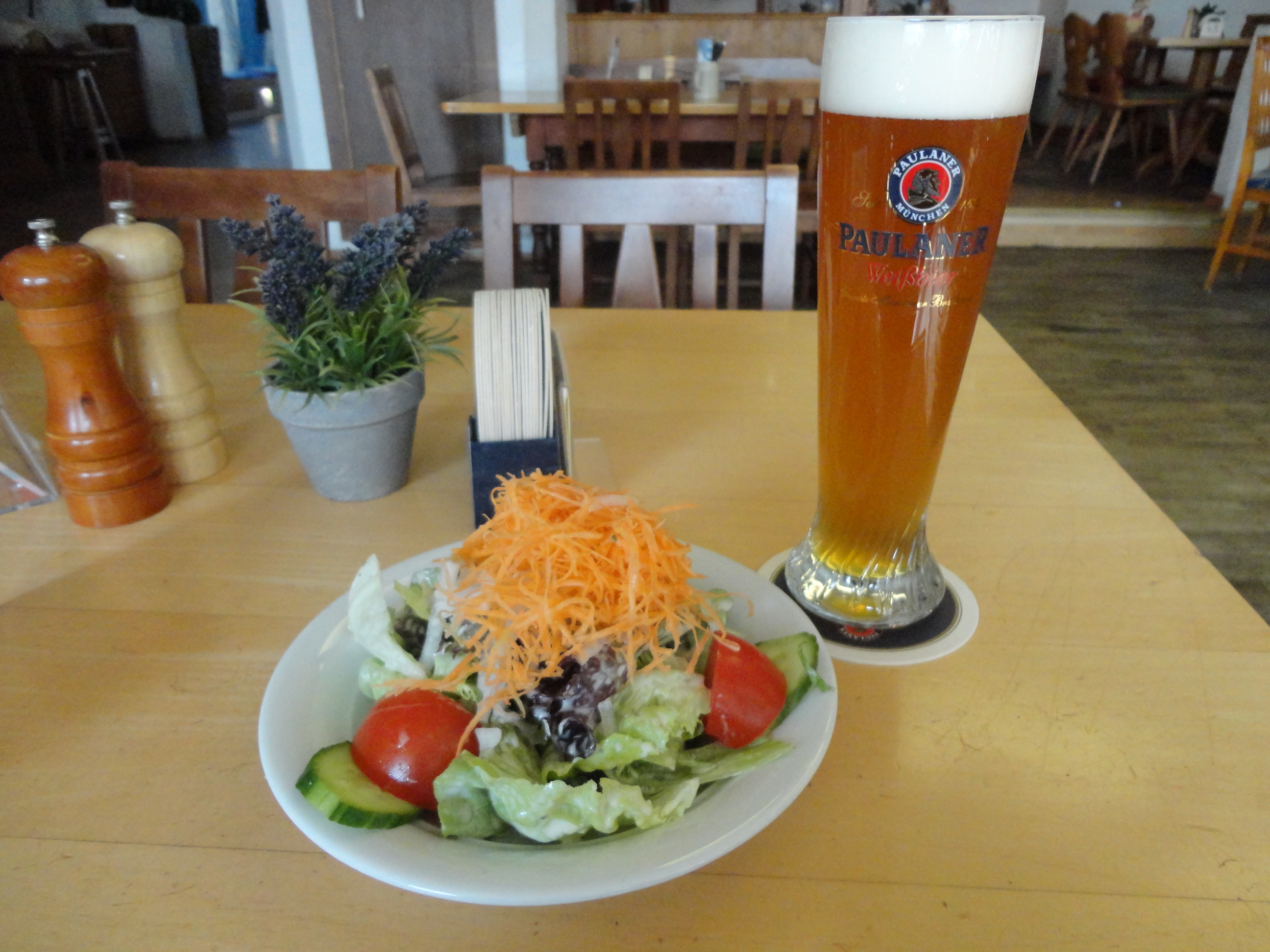 昼食は、最近ミュンヘンのビール醸造所「パウラーナー」のビア・レストランが進出しているので、ここに行ってみることにした。カジノがあるクーア・ハウスに対面して建つホテル・ナッサーホフの並びでヴィルヘルム通りの最北端のビルの1階を占める大きな店である。近代的なビルの中なのでちょっと違和感があるが、出されるビールと料理はミュンヘンそのもの。