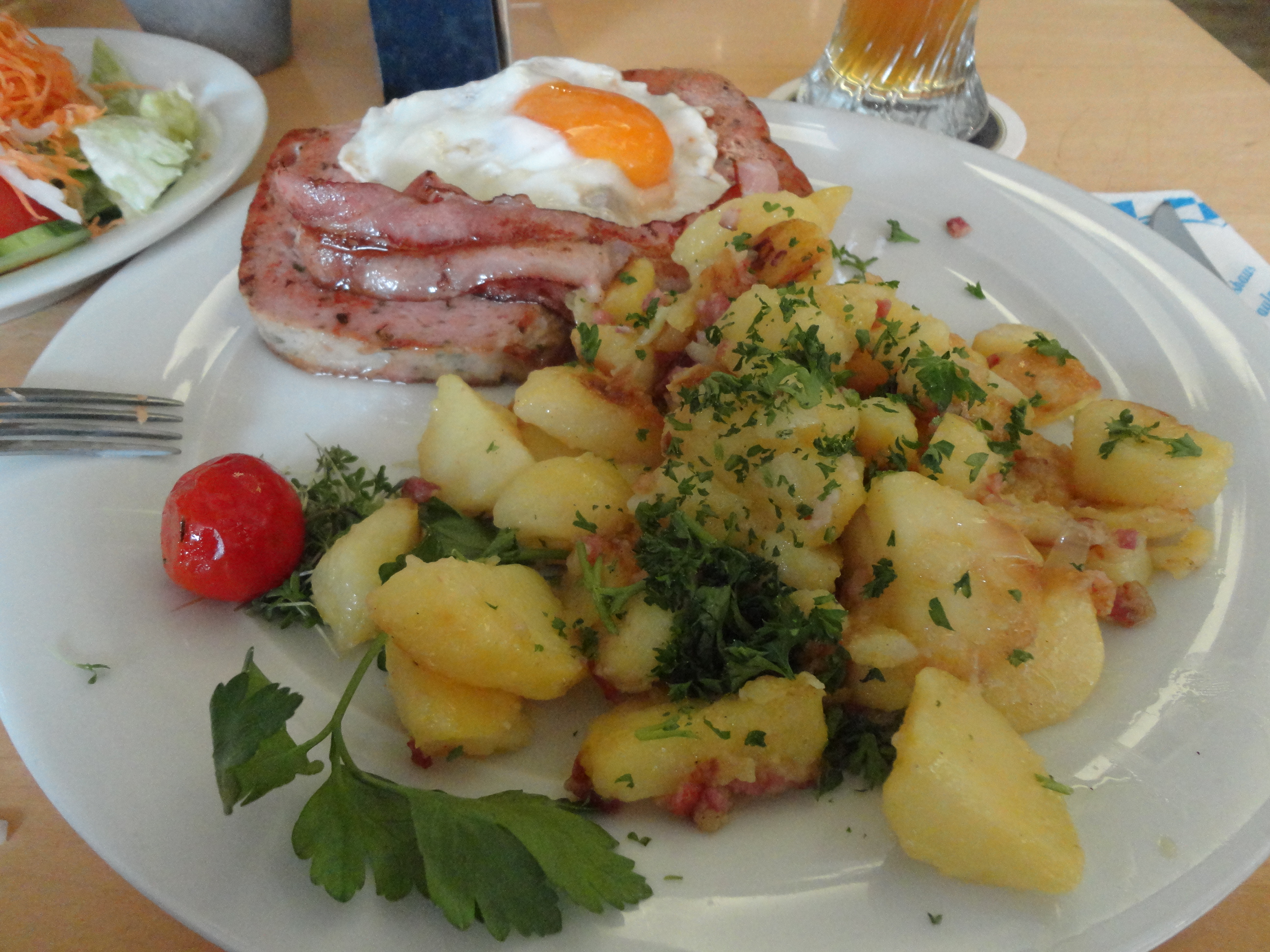 昨夜もハノーファーのパウラーナーの店で夕食を摂ったが、何回飲んでもこのヘフェ・ヴァイス(小麦のビール)のビールは旨い。昼食としては、これもバイエルンの名物料理、「ミート・ローフ」を頼んだ。どうということのない料理なのだが、サラダが大量に付いているのが嬉しい。