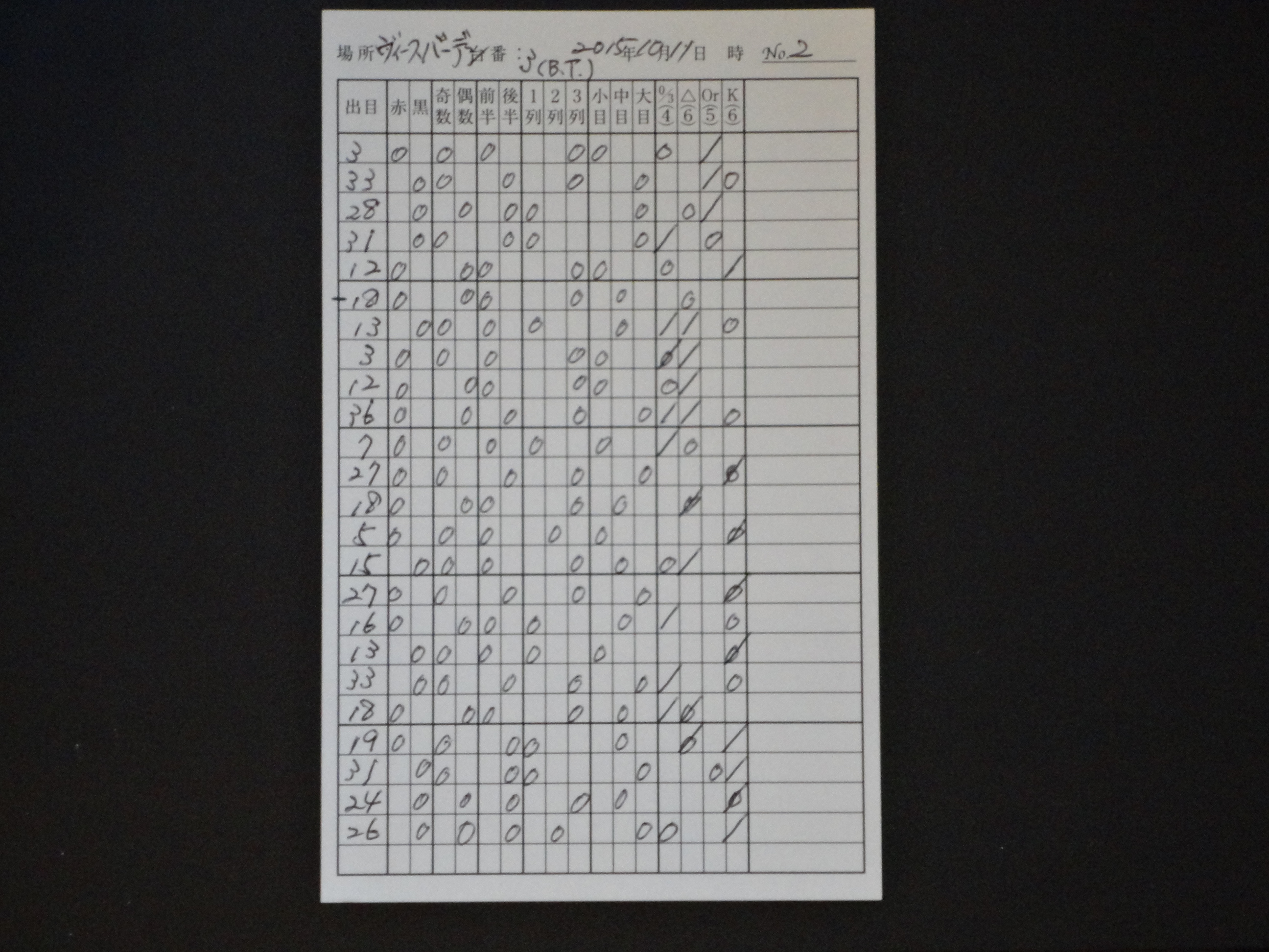 旅打ちを続けるためには、大きく勝つことよりもまず負けないことが大事なので、数字に賭けるよりも37の数字の盤面を4つに分けてゾーンで狙うことを中心で攻めているが、今回はその4つに分けたゾーンでの賭けをわかり易くするために、使用するオリジナルの出目表を作り直した。0/3(ゼロ・スピール)-△-Or(オフラン)-K(クライン・セリー)という流れで記載できるようにしたので、次に出るゾーンの推理がしやすくなった。