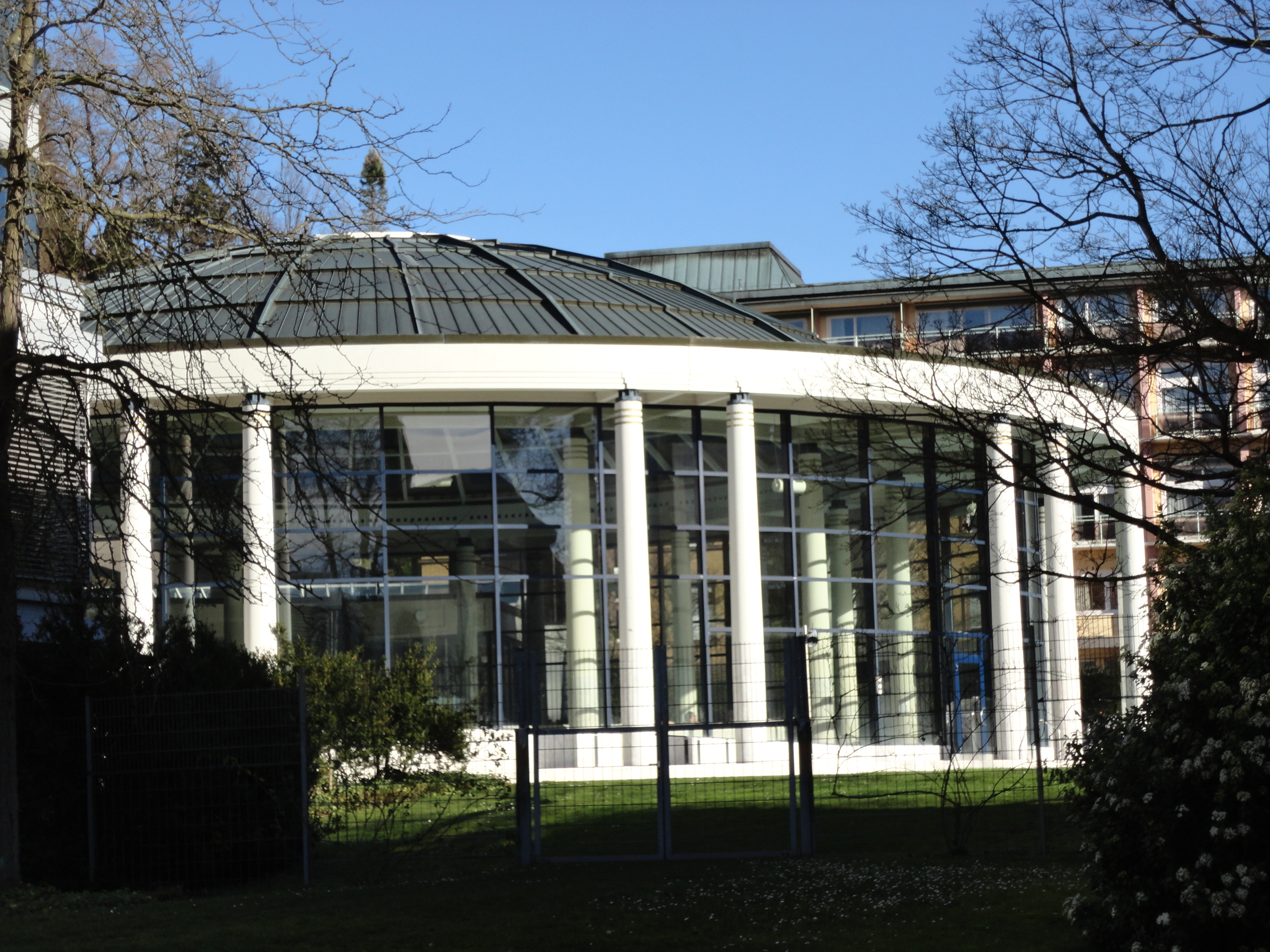ドイツでの温泉治療というと、温泉に浸かるというよりも、「飲用」の方が一般的である。源泉温水が飲める場所がクーア・ハウスの隣の建物「トリンクハレ」である。ギリシャ風の建物自体も立派であるが、建物の壁面に描かれたこの地方の伝説をテーマにしたフレスコ画が興味深い。ここでは、無料で誰でも源泉温水を飲むことが出来る。