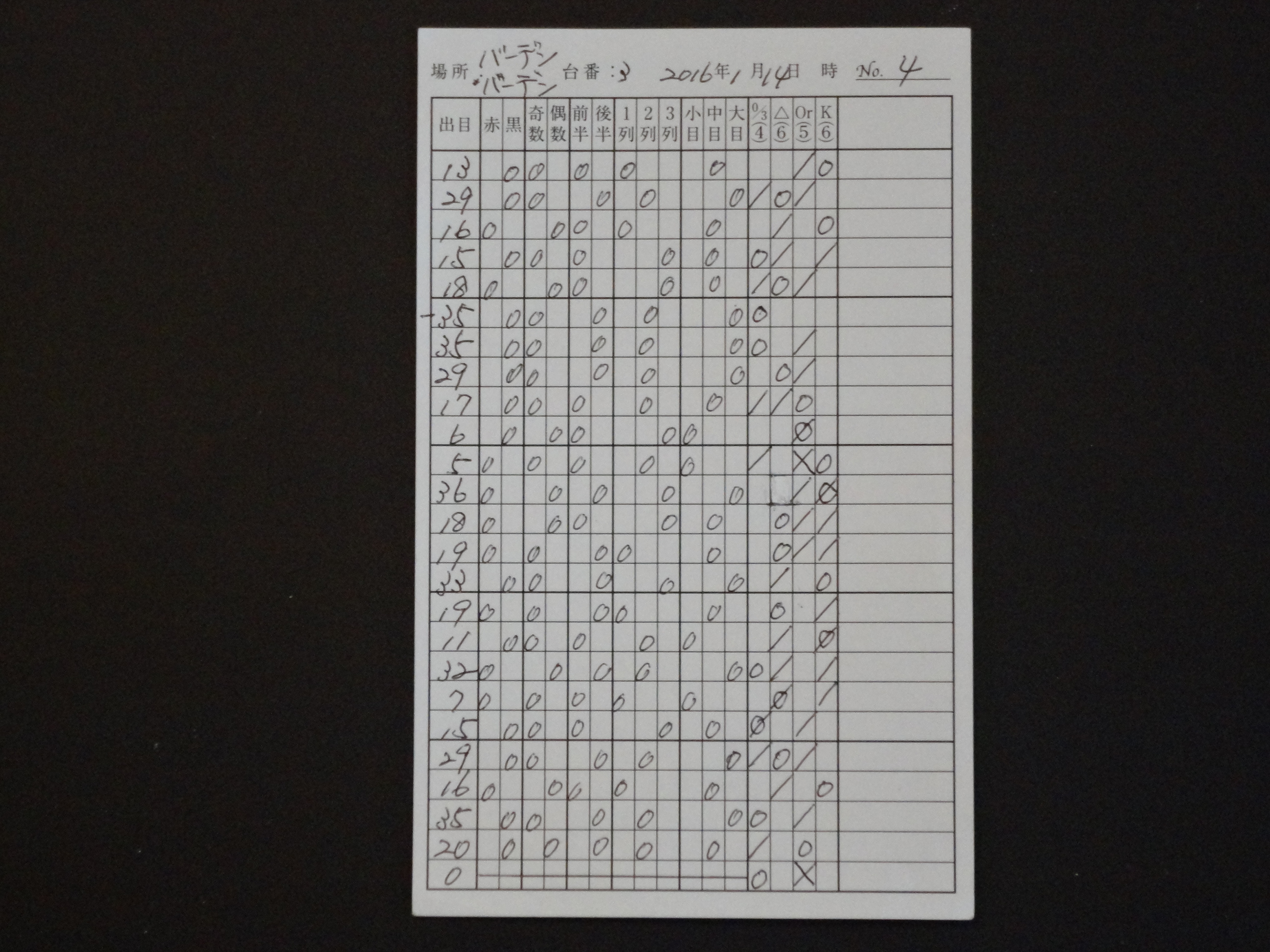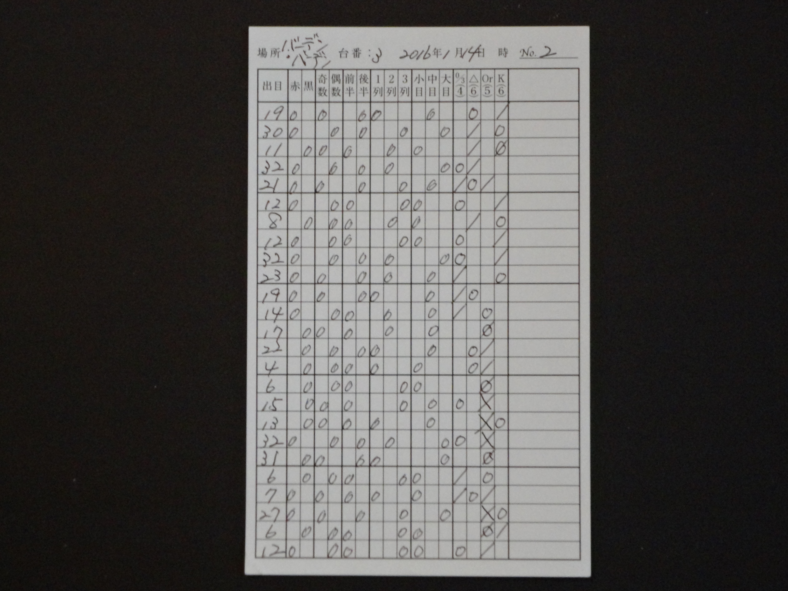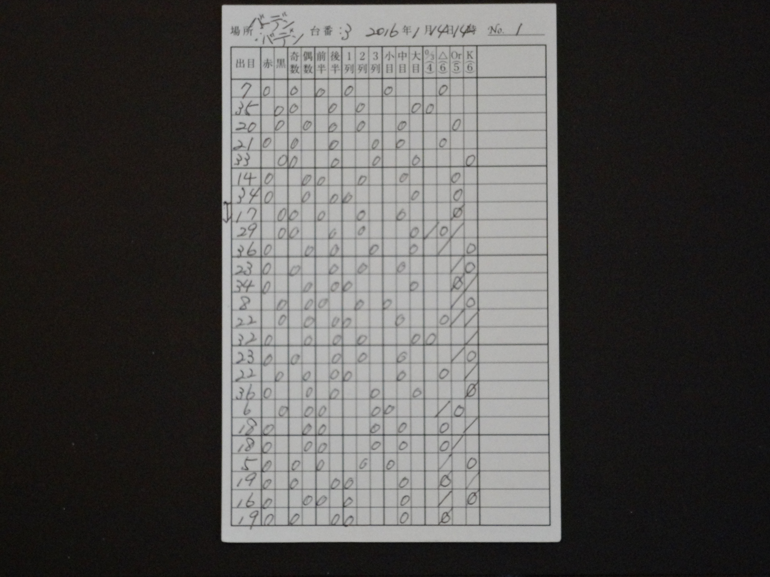 筆者は、ヨーロピアン・ルーレットの37の数字の盤面を4つに分けてゾーンで狙うことを中心に攻めているが、今回はその4つに分けたゾーンでの賭けをわかり易くするために、使用するオリジナルの出目表を作り直した。0/3(ゼロ・スピール)-△-Or(オフラン)-K(クライン・セリー)という流れで記載できるようにしたので、次に出るゾーンの推理がしやすくなった。