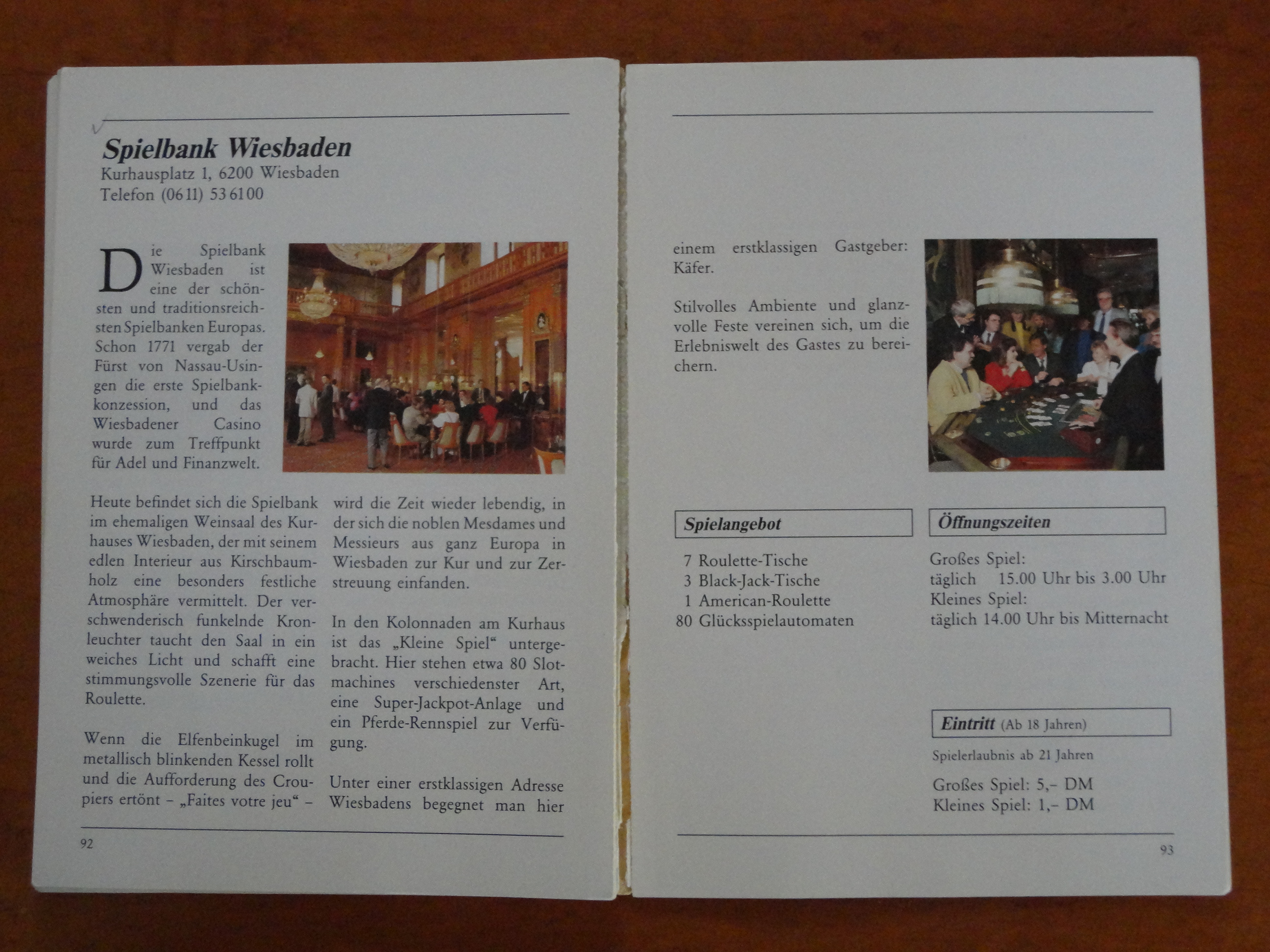 ドイツ統一前のこの時期は、このカジノではほとんど不敗といってもいいほどの戦績が続いた。そのため、フランクフルトからは相当の距離があるにも拘らず通い続けたものである。現在はマシンのみになってしまったので、足を向けることはない。