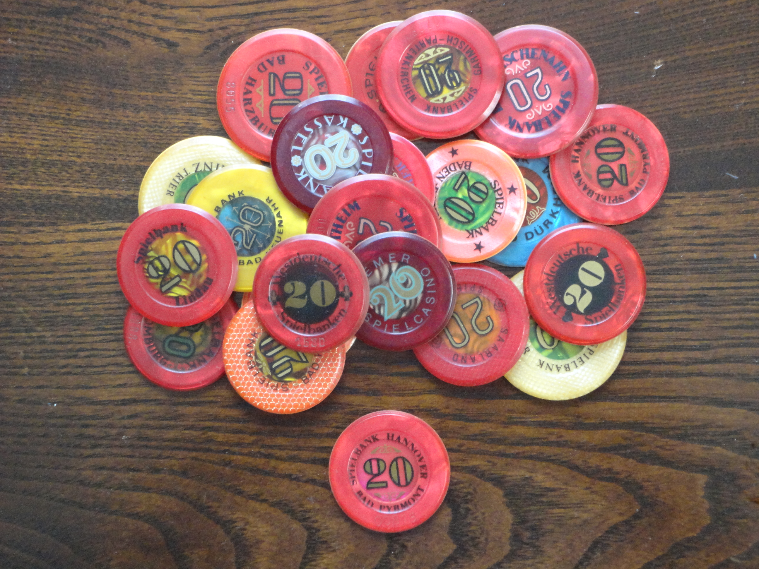 このドイツカジノガイド本を手に入れた後に、掲載されていた30ヵ所を廻ろうと思って頑張ったのですが、27ヵ所しか行けなかったのです。今回のレポートの写真にある20マルクチップは記念に持って帰ってきたものです。