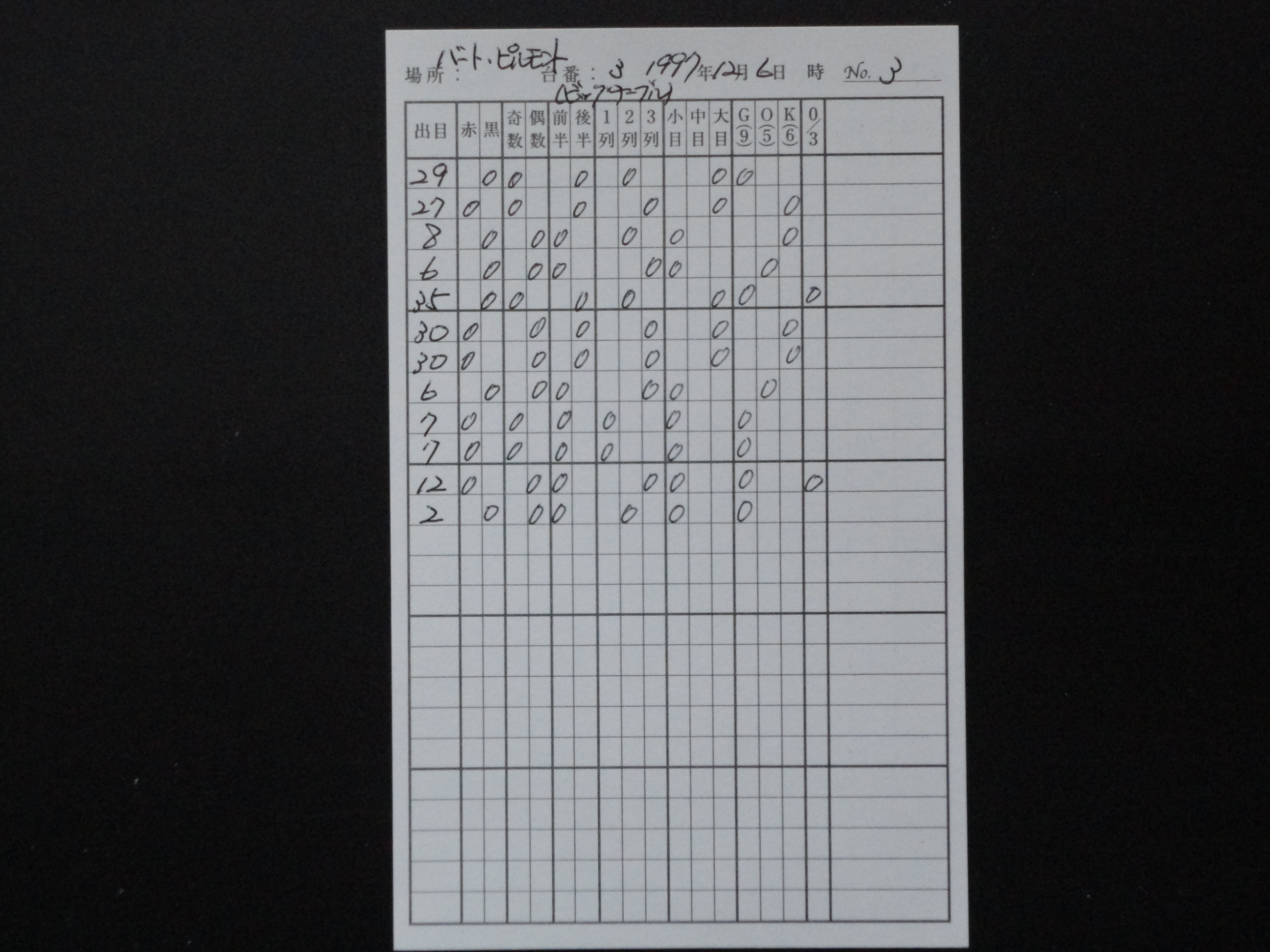 この時、老齢の婦人が2人、筆者の右隣の席とそれに続く下座のクルーピエの手前の席に座った。それぞれが持参のポーチを開けて、ミニマムの2マルクのチップをテーブルに積む。この時間には年金生活の老婦人達が毎日のようにカジノに通っているのをよく見るが、仲間同士おしゃべりしながら賭けているので騒がしくもあり、賭けた場所を覚えていないようで、当たった時のトラブルも多く余り歓迎できる賭け人とはいえない。夜に入って、台のミニマムが2マルクから5マルクに上げられる頃には退場しているのだが、筆者にとっても余り同席したくないのが本音。せっかく、流れに乗りかけたのにと眉をひそませるが、案の定、