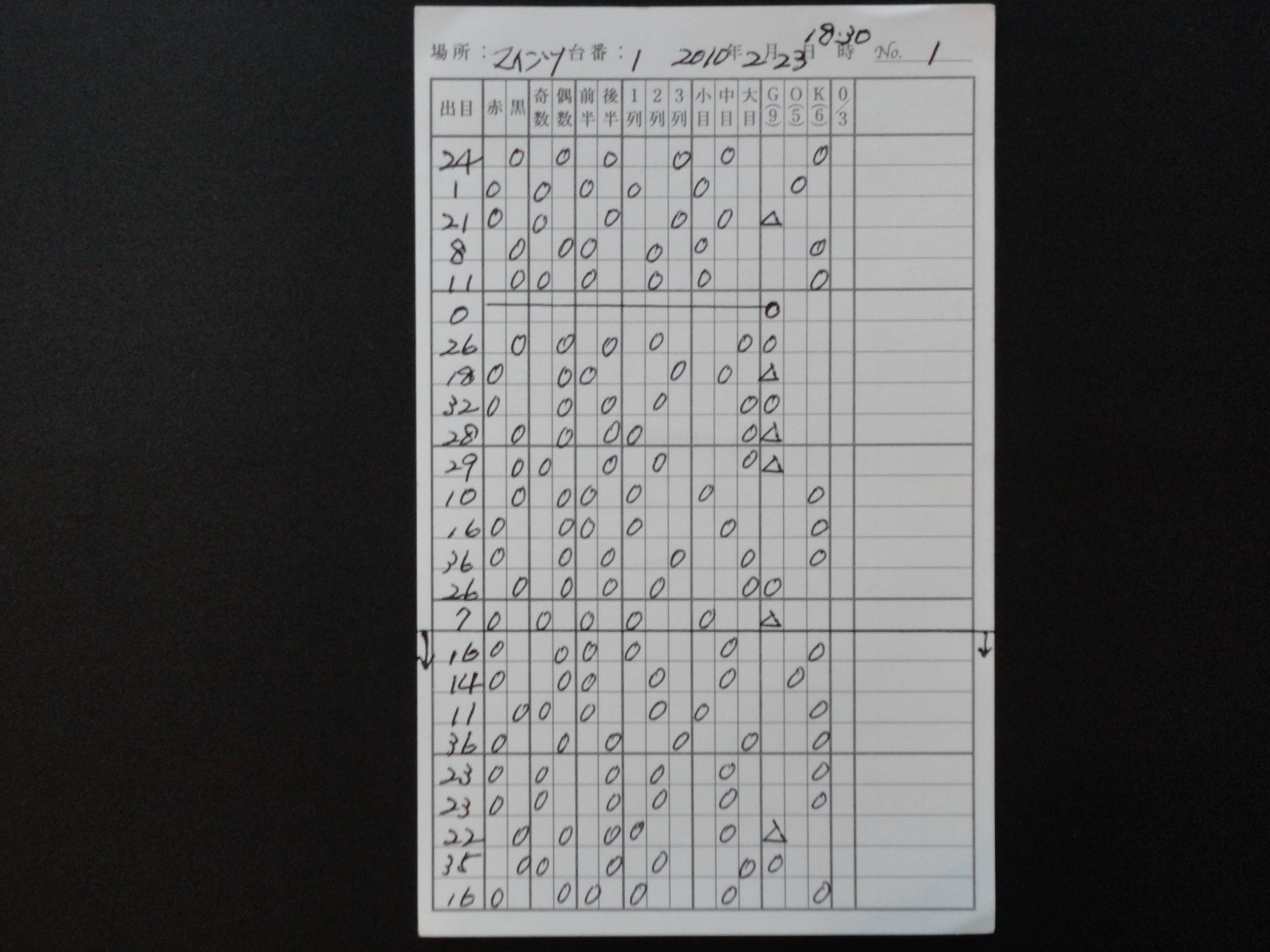 G(グロース・・・盤面の中心26を真ん中にした17個の数字のゾーン)とK(クライン・・・26の反対側の12個の数字のゾーン)に交互に寄っていて、1を除いてはOr(オフラン・・・GとKに挟まれた左右合計8個の数字のゾーン)は全く出ていません。どうもOrが今日の鍵になりそうな出目の状態です。