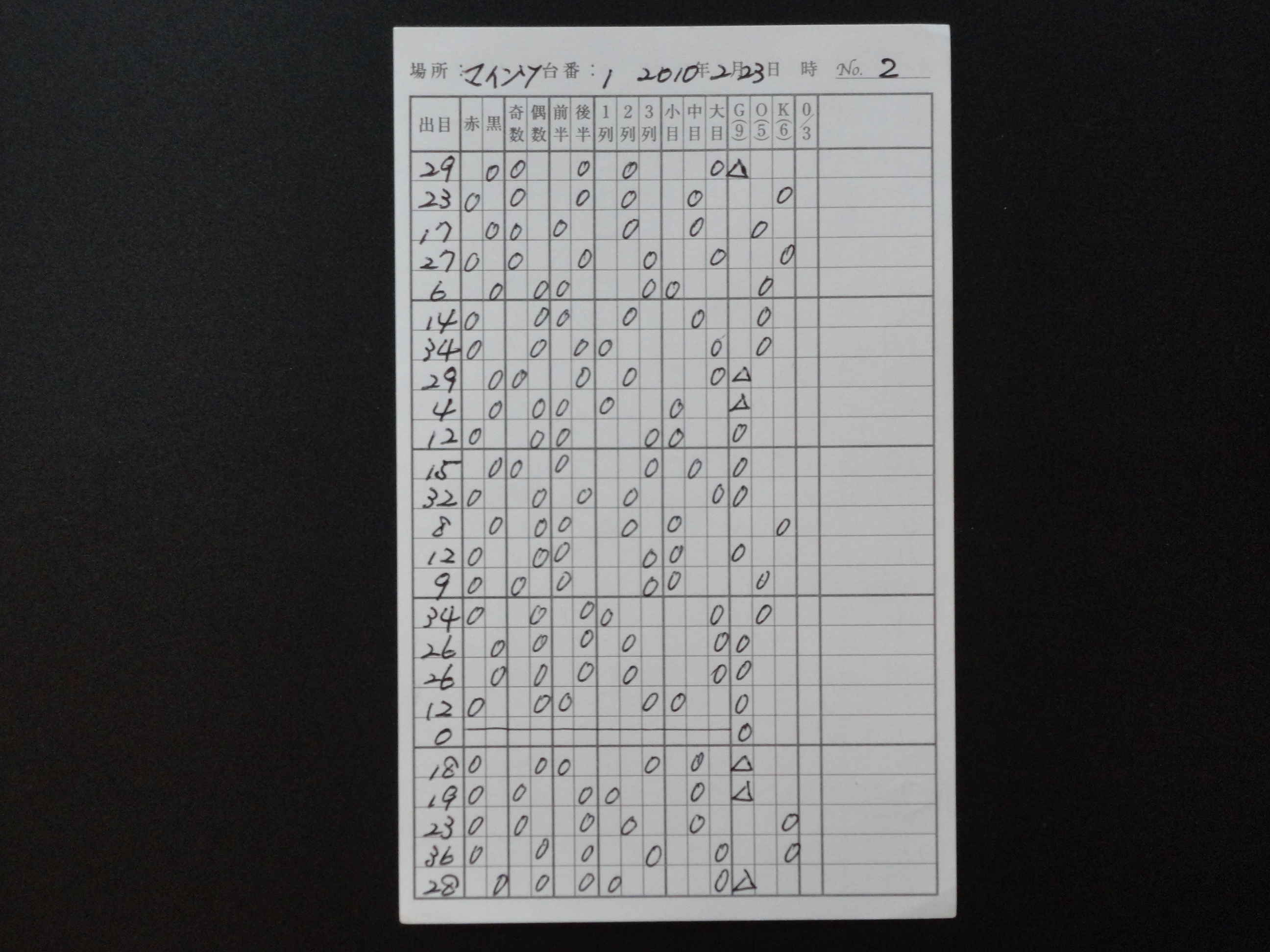 筆者は、Gの17個の数字のゾーンを0/3(ゼロ・スピール・・・26を真ん中にして左右3数字ずつの合計7数字のゾーン)と△(筆者独自のマークとゾーン概念で17数字から0/3の7数字を除外した0/3とOrの間の左右10数字のゾーン)とに分けて捉えています。これによって、ゾーンからの数字の推定が格段にやり易くなっているのです。
