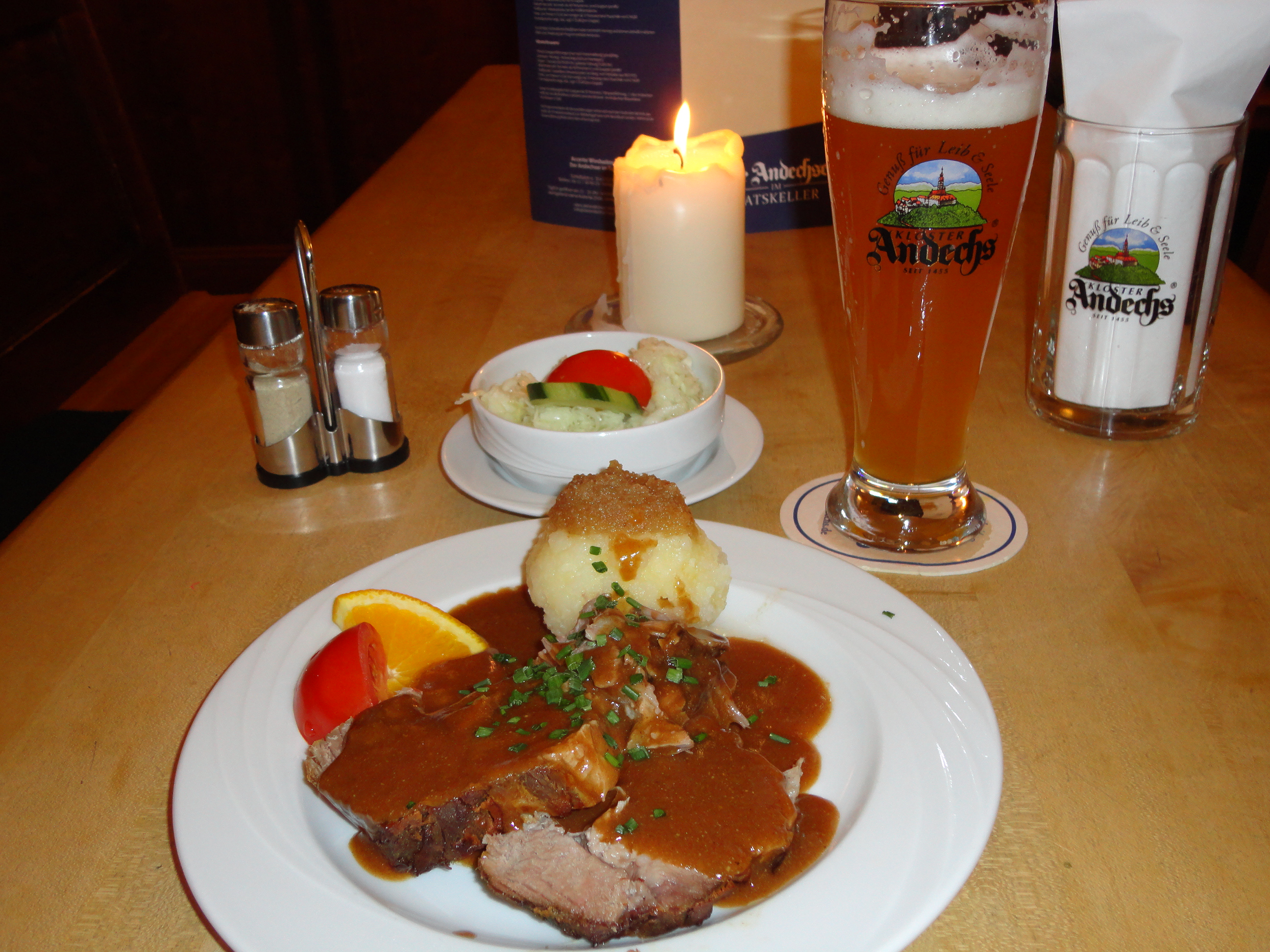昼食に頼んだ料理は、「シュヴァイネブラーテン」という皮付きの豚肉を焼いて、厚めにスライスして独特のソースを掛けたもので、まさにバイエルンの代表料理。この地方の豚肉も旨いのですが、何といってもカリカリに焼いた皮が旨い。付け合わせのコールスローサラダも癖になります。