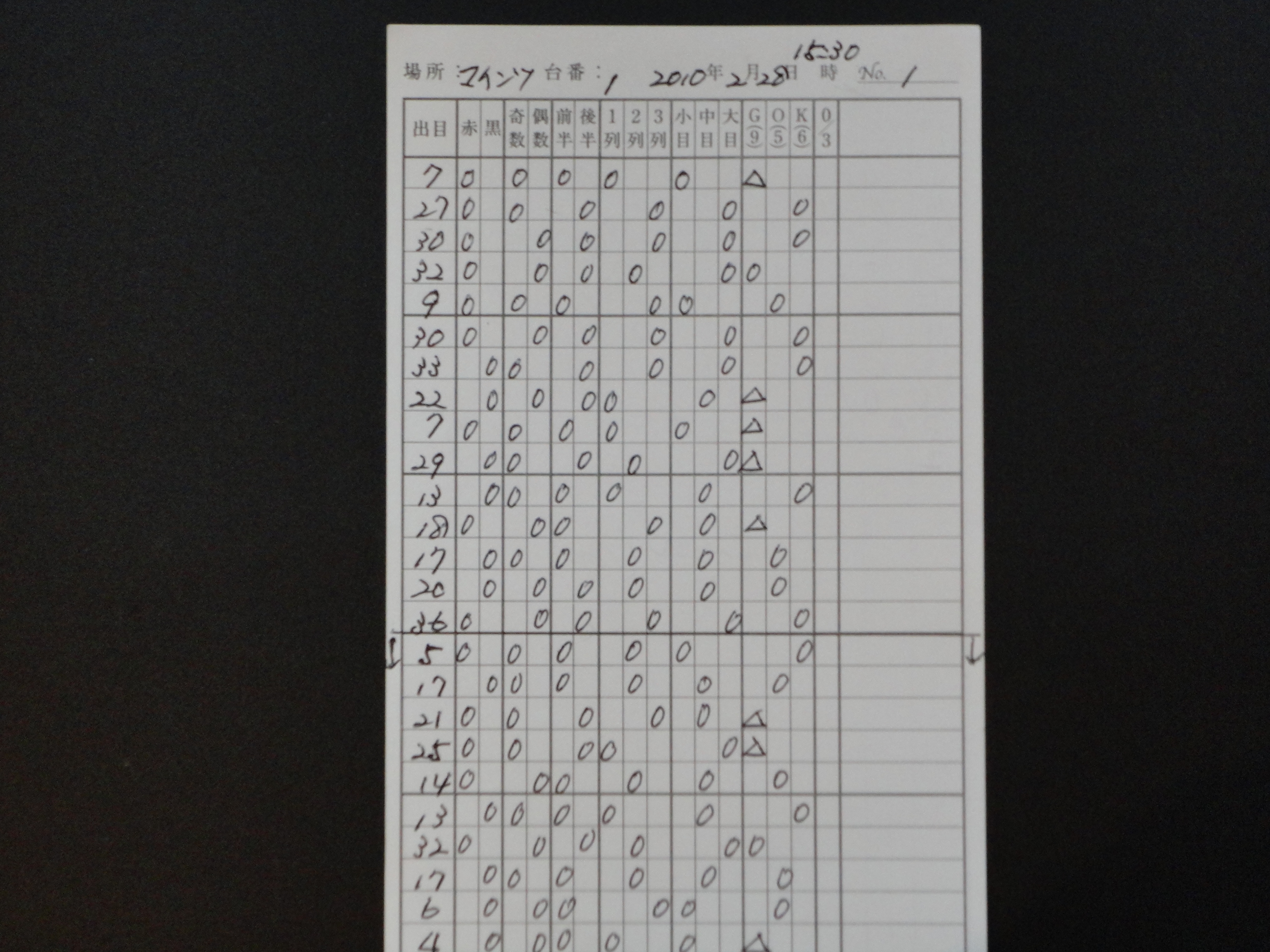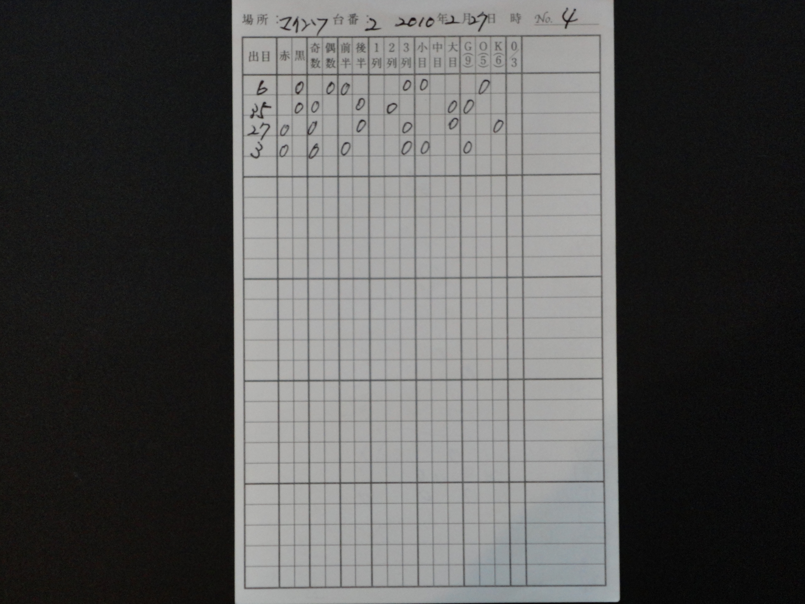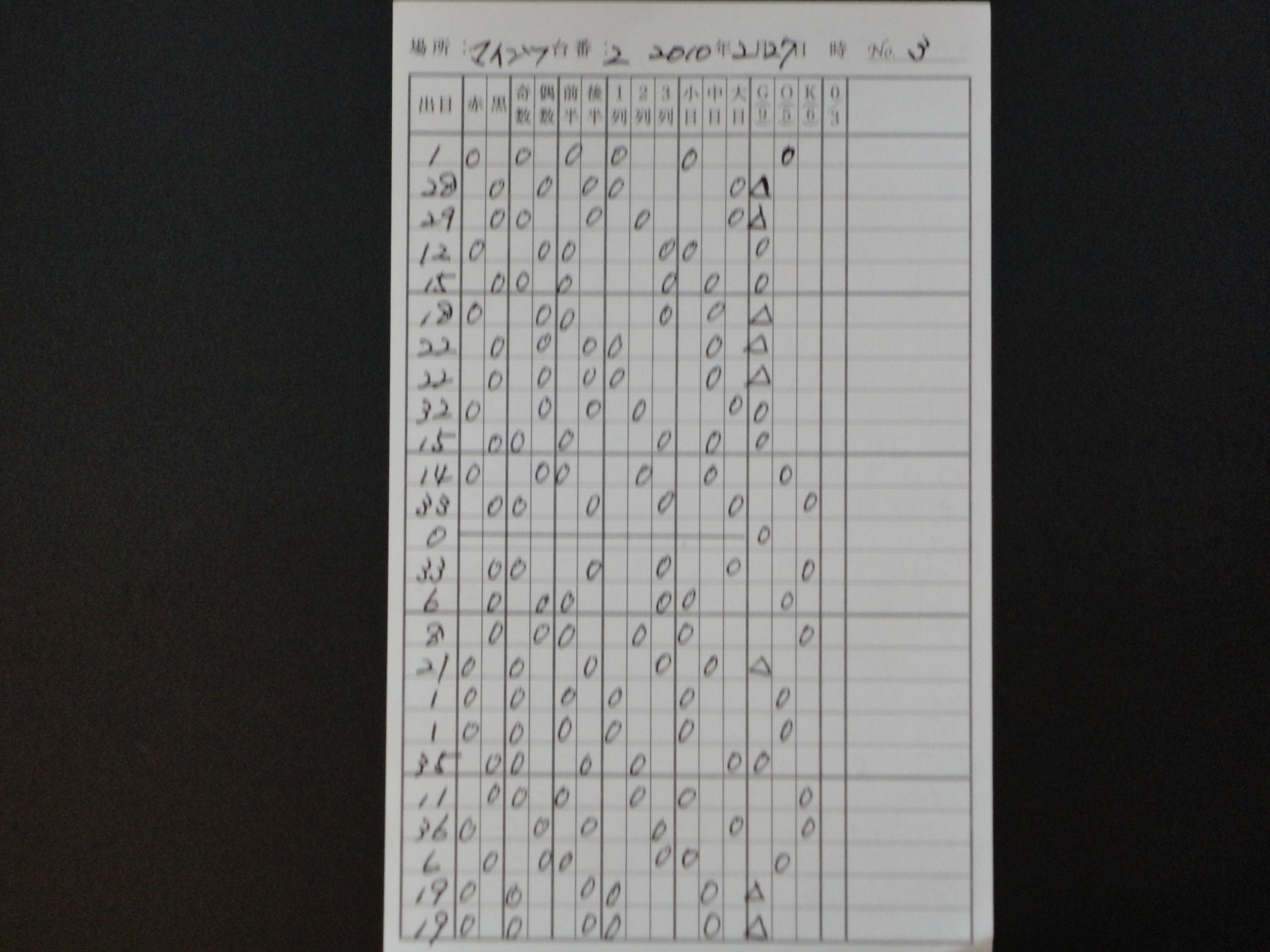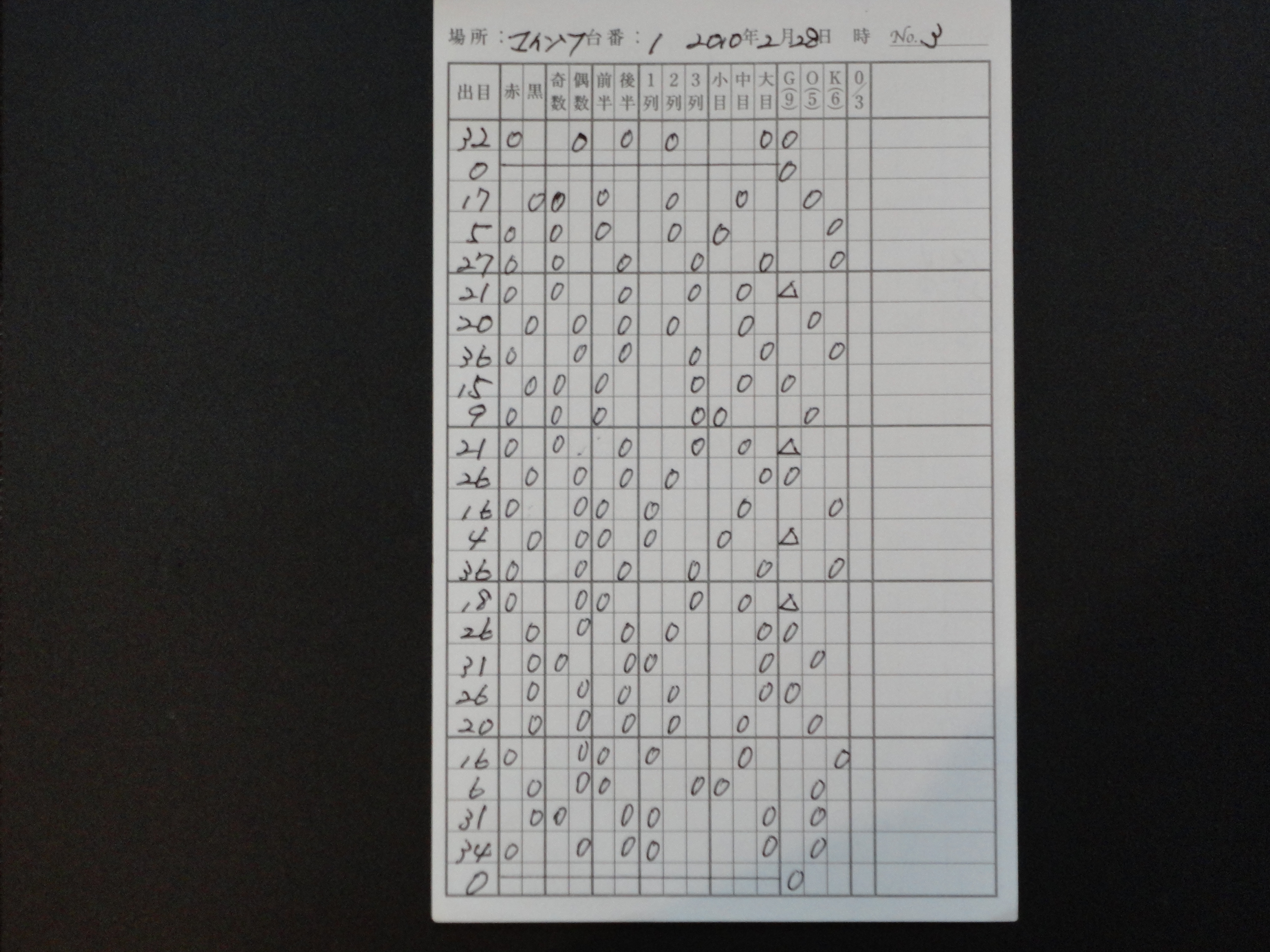 7以前は表示盤から消えてしまっているのでわかりませんが、どうやら遅れて来たのは不幸と出たようです。いつもの掛け方ですと、27の次の30では121枚、その次の30でも121枚、さらに次の33では51枚が取れているはずです。いずれもKの大のライン、集中して狙う数字です。この出目に出会えなかったのは、残念としか言えません。